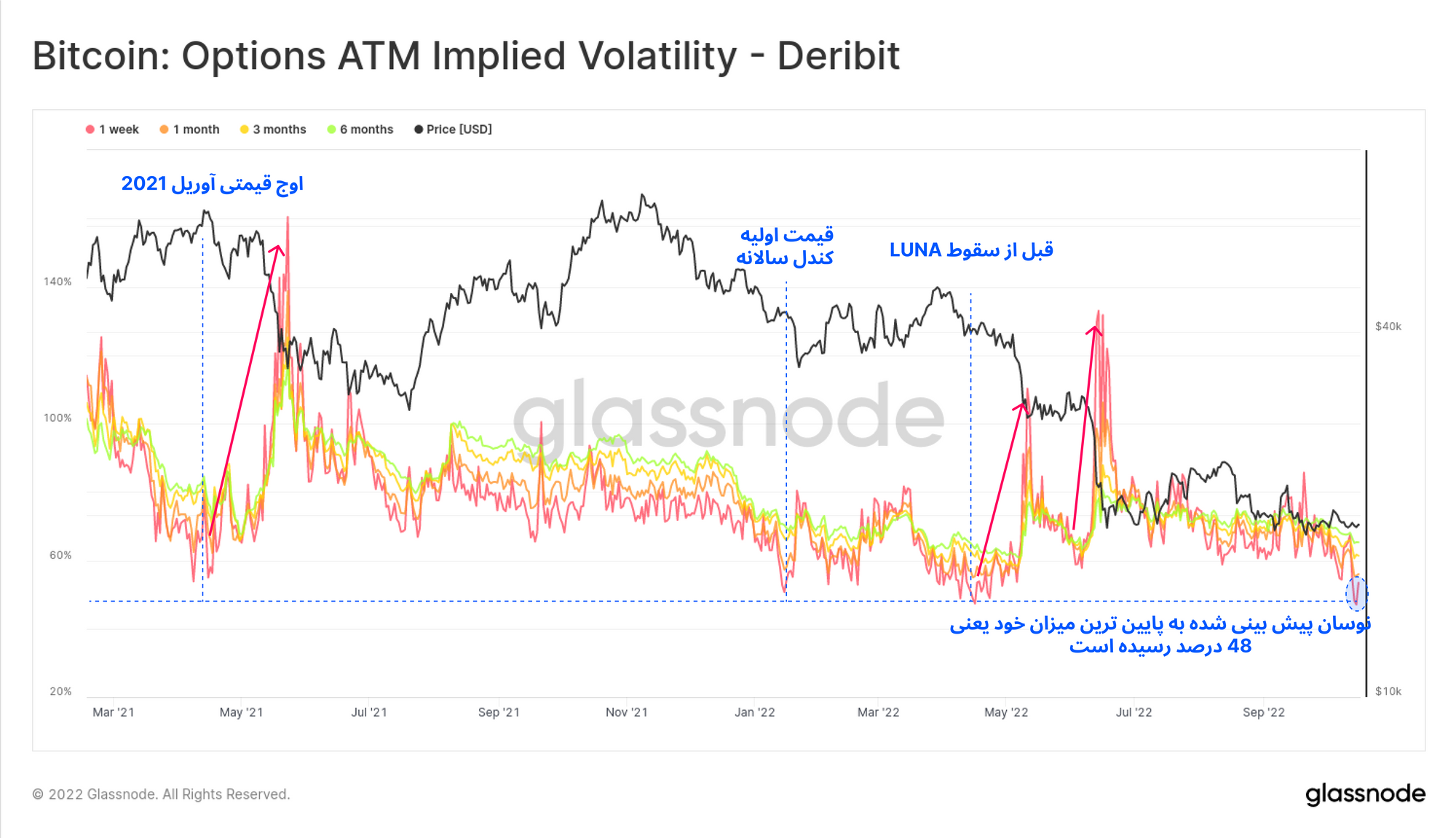 در فضای خارج از شبکه بیتکوین مانند بازار مشتقات نیز، نوسانات بسیار کمی پیشبینی میشود. نوسان کوتاهمدتی که در بازار آپشن برای بیتکوین پیشبینی میشود، در این هفته به پایینترین مقدار خود، ۴۸ درصد رسیده است. در چندین نمونهی قبل که بازار آپشن چنین نوسان اندکی برای بیتکوین پیشبینی کرده بود، بازار پس از گذشت این دوره، با نوسانات شدیدی رو به رو شد که اغلب با بحران کمبود وثیقه در بازار مشتقات و معاملات Defi همراه بود.