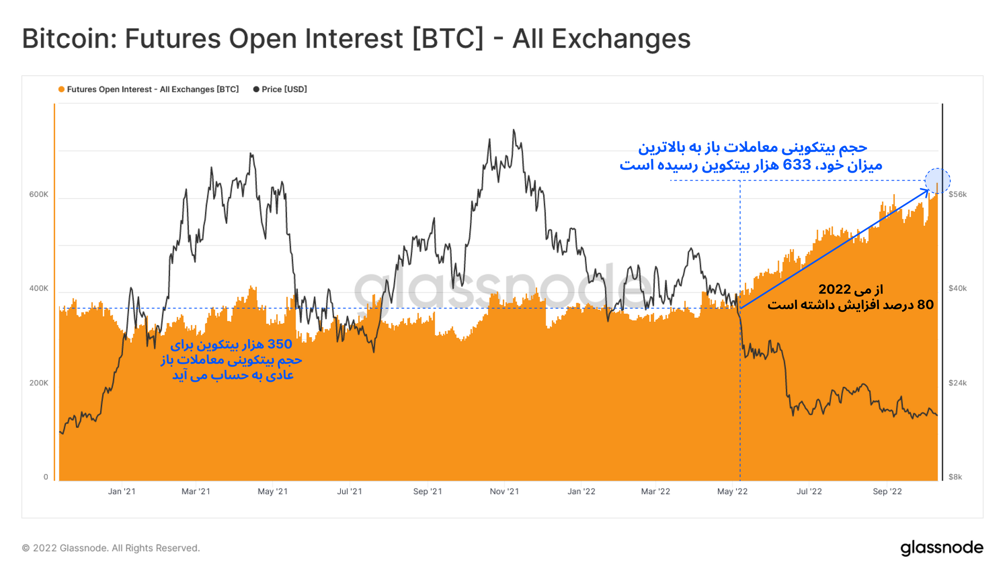 همچنین از تاریخ سقوط پروژه LUNA، حجم بیتکوینی معاملات باز فیوچرز نیز به شدت رو به افزایش بوده است. حجم بیتکوینی معاملات باز فیوچرز به بالاترین میزان خود، ۶۳۳ هزار بیتکوین معادل افزایش ۸۰ درصدی از ماه می امسال رسیده است. این افزایش حجم بیتکوینی معاملات باز نشان میدهد که بر خلاف کاهش چشمگیر قیمت بیتکوین، گمانهزنیها و محافظت از معاملات در برابر ضرر، بسیار در حال افزایش است.