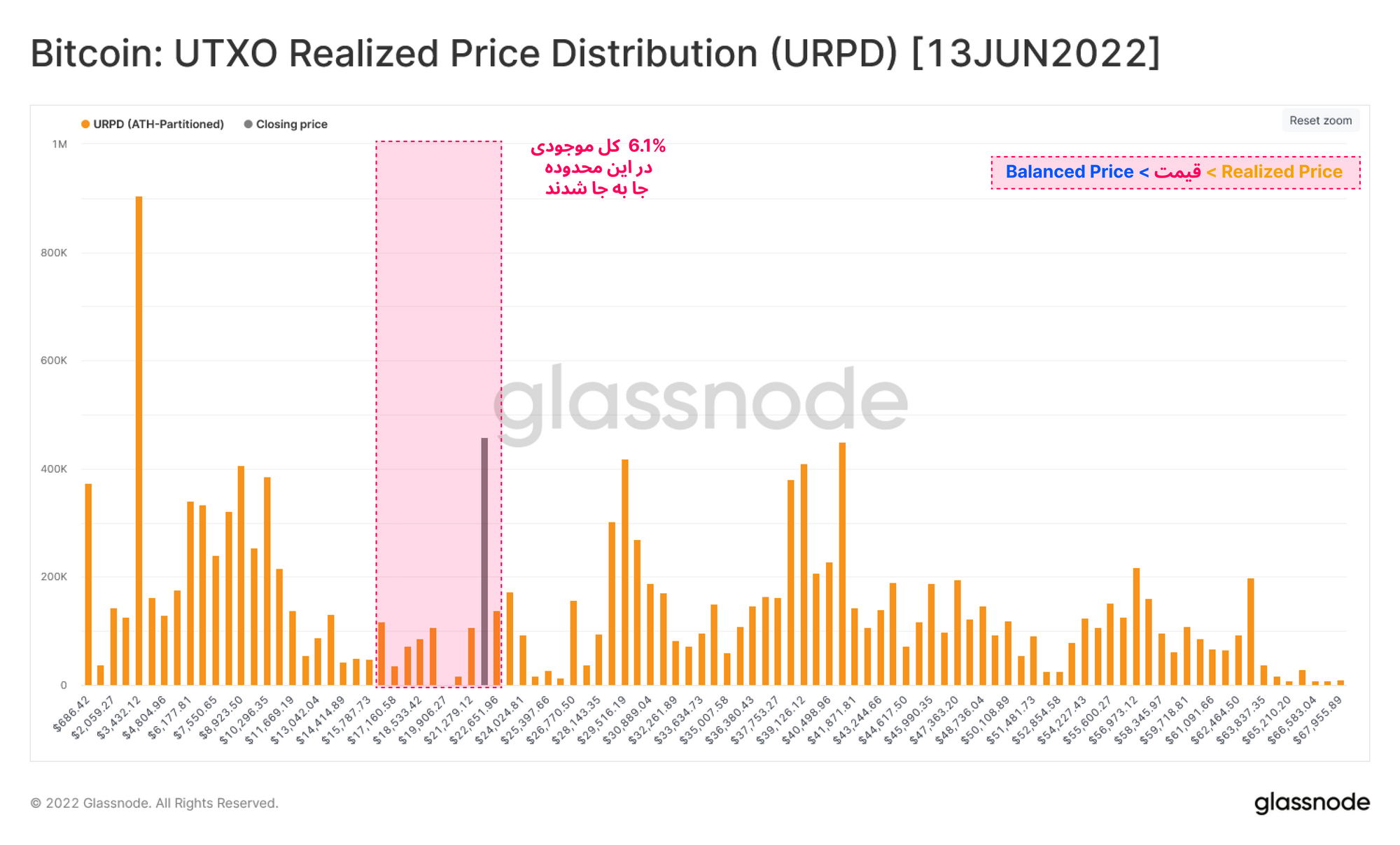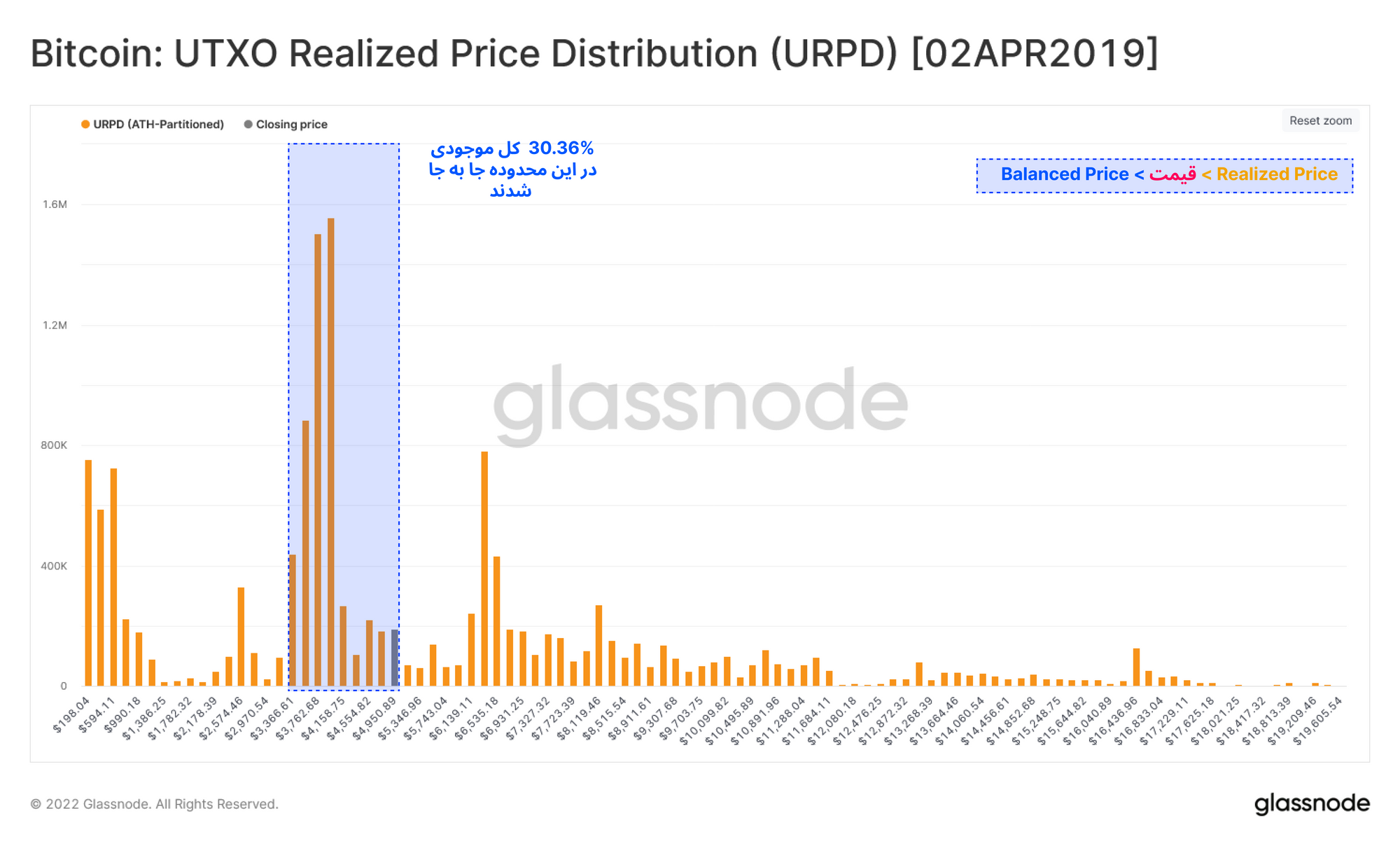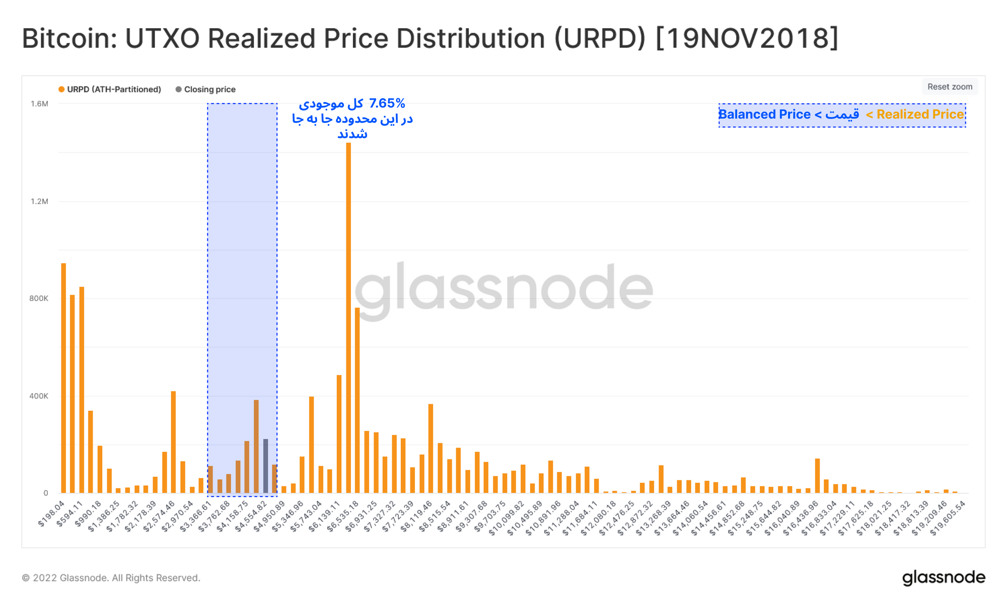 هنگام تشکیل کف قیمتی در بازه زمانی ۲۰۱۹-۲۰۱۸، حدود ۲۲.۷ درصد موجودی بیتکوین (۷.۶۵% - ۳۰.۳۶ %) زمانی که بازار میان این محدوده قیمتی (قرمز رنگ)حرکت میکرد، دوباره توزیع و جابه جا شدند.