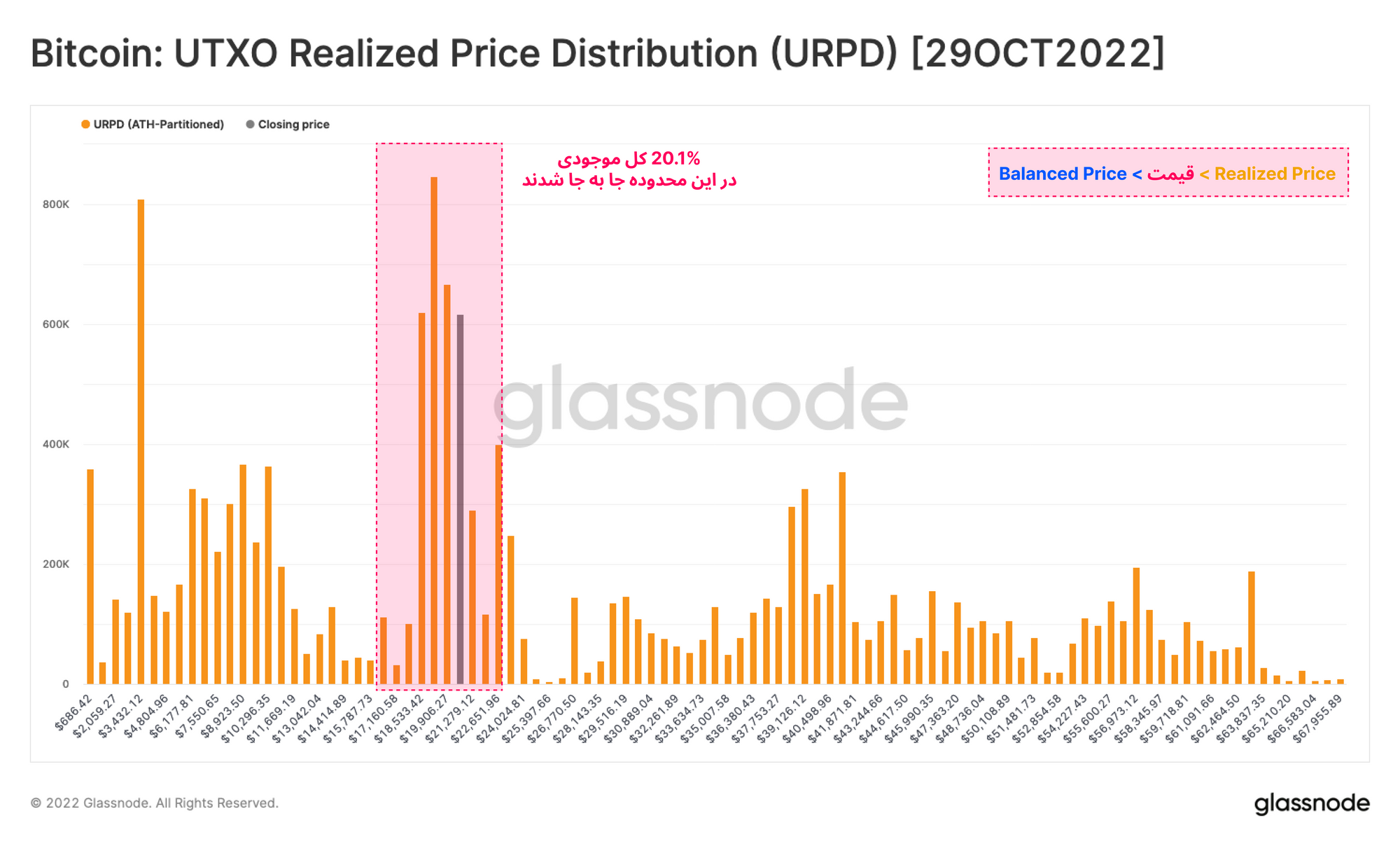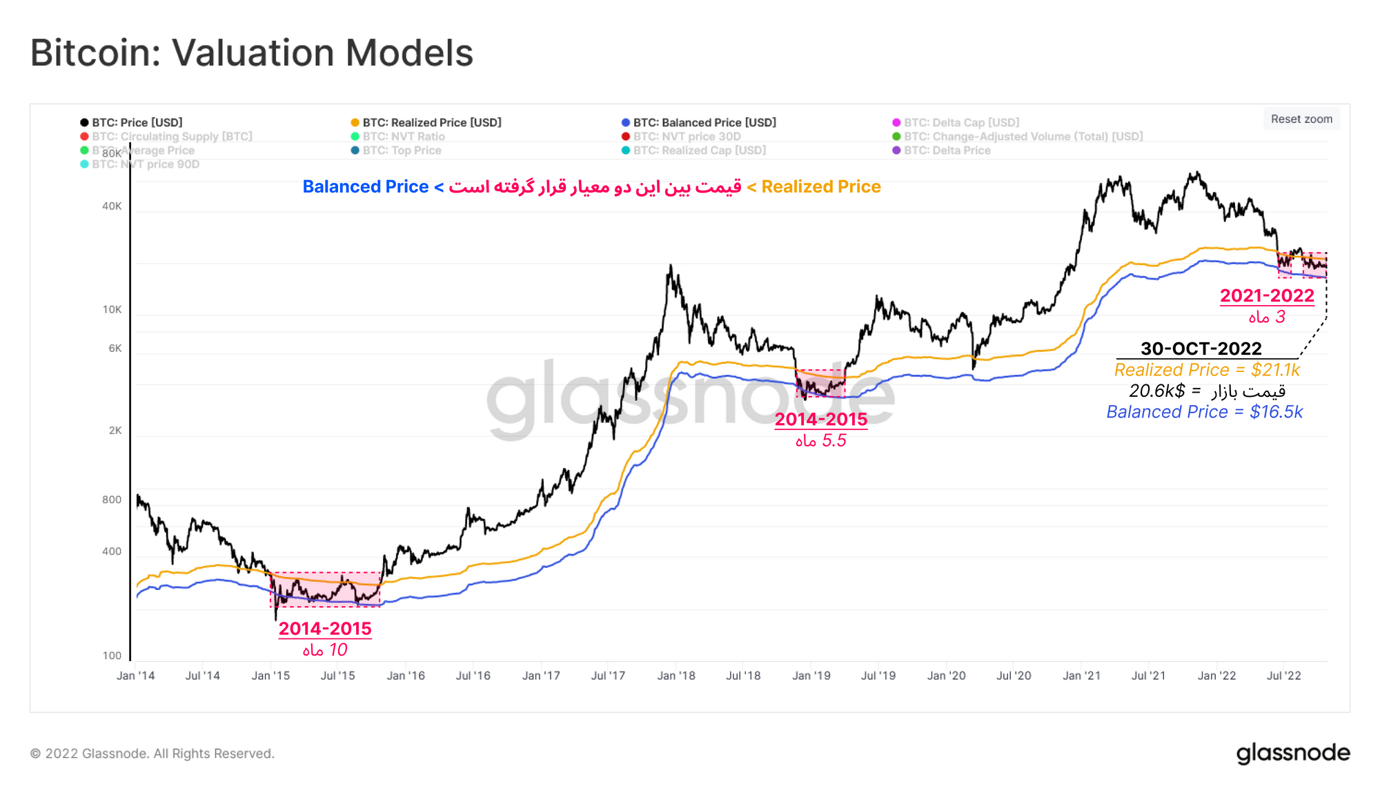 در این گزارش از چندین معیاری که برای تشخیص محدوده قیمتی مناسب هستند، استفاده کردهایم. طبق مشاهدات، به نظر میرسد که تاکنون روند تشکیل کف قیمتی این چرخه همانند چرخههای گذشته باشد. با استفاده از معیار Balance Price (۱۶.۵ هزار دلار) و Realized Price (۲۱.۱ هزار دلار) نیز محدوده ی قیمتی که بازار هنگام تشکیل کف قیمتی احتمالاً در آن نوسان خواهد داشت، مشخص شد.