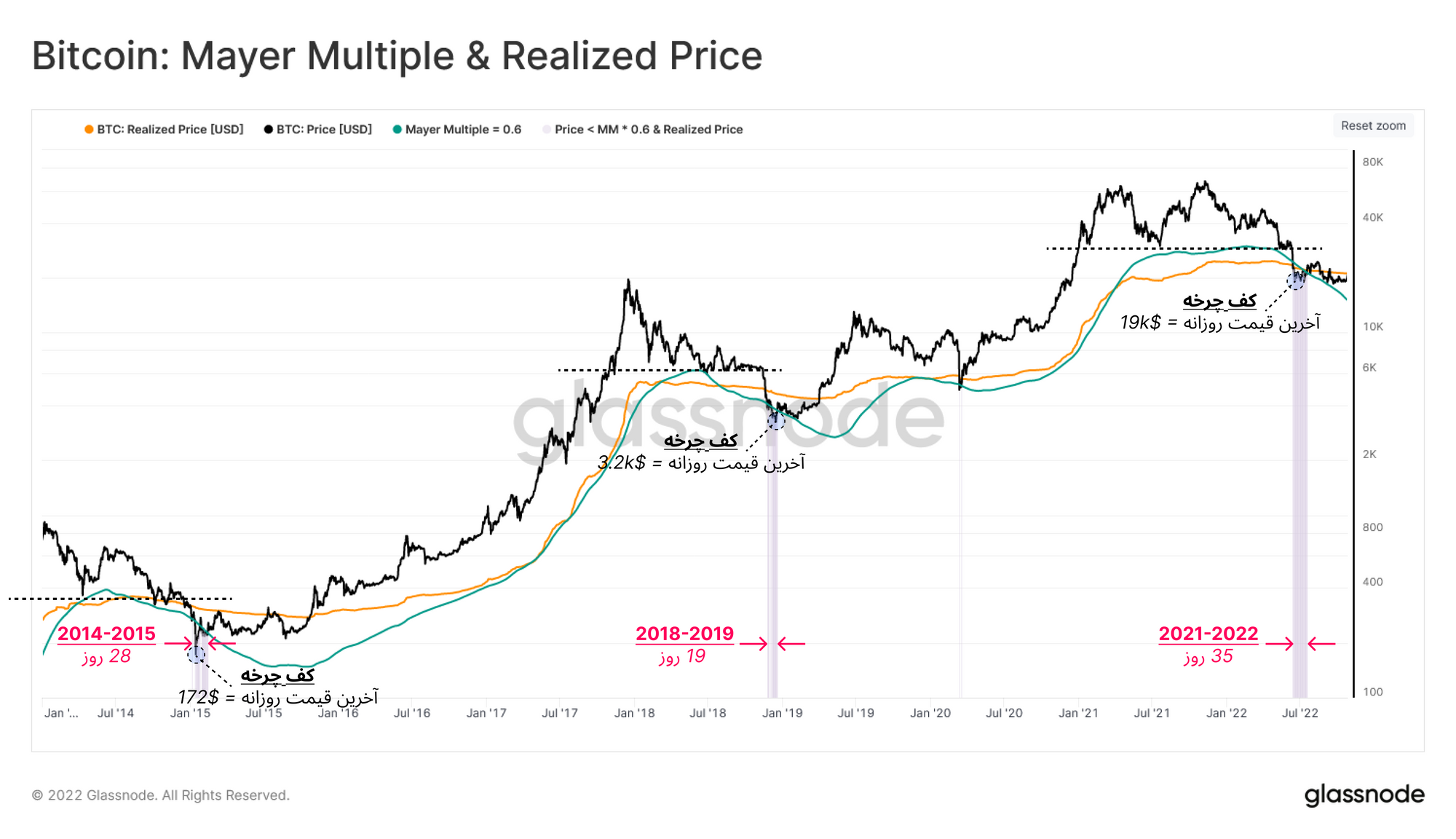 . معیار Mayer Multiple Lower Band : این معیار نسبت میان قیمت و Small Moving Average دویست روزه که در تحلیلهای مالی سنتی بسیار مورد استفاده قرار میگیرد، مشخص میکند. این ابزار نواحی اشباع خرید و اشباع فروش بازار را مشخص می کند و طبق چرخههای گذشته، هر زمانی که این معیار به زیر مقدار ۰.۶ برسد، بازار دچار اشباع فروش می شود. در ماه ژوئن قیمت به مدت ۳۵ روز، زیر هر دو معیار قرار داشت و این الگو دوباره در فازخرسی کنونی تکرار شد. هماکنون قیمت در نزدیکی Realized Price در سطح ۲۱,۱۱۱ دلار قرار دارد و در صورتی که از این سطح عبور کند، این حرکت می تواند به این معنا باشد که بازار به قدرت نسبی دست پیدا کرده است.