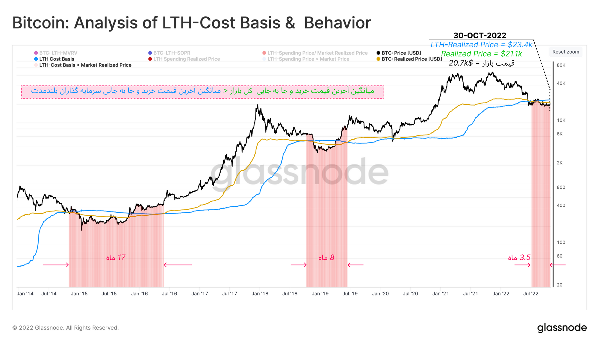 الگویی که در مراحل آخر فاز خرسی تمام چرخههای قبل ظاهر شده، تسلیم سرمایهگذاران بلند مدت بوده است 🟥. در این بازه زمانی، میانگین آخرین قیمت خرید یا جابهجایی سرمایهگذاران بلندمدت بالاتر از Realized Price 🟠قرار میگیرد. در چنین حالتی سرمایهگذاران بلندمدتی که نوسانات تمام چرخه بازار را تحمل کردند، نسبت به باقی سرمایه گذاران بازار عملکرد ضعیفتری دارند.