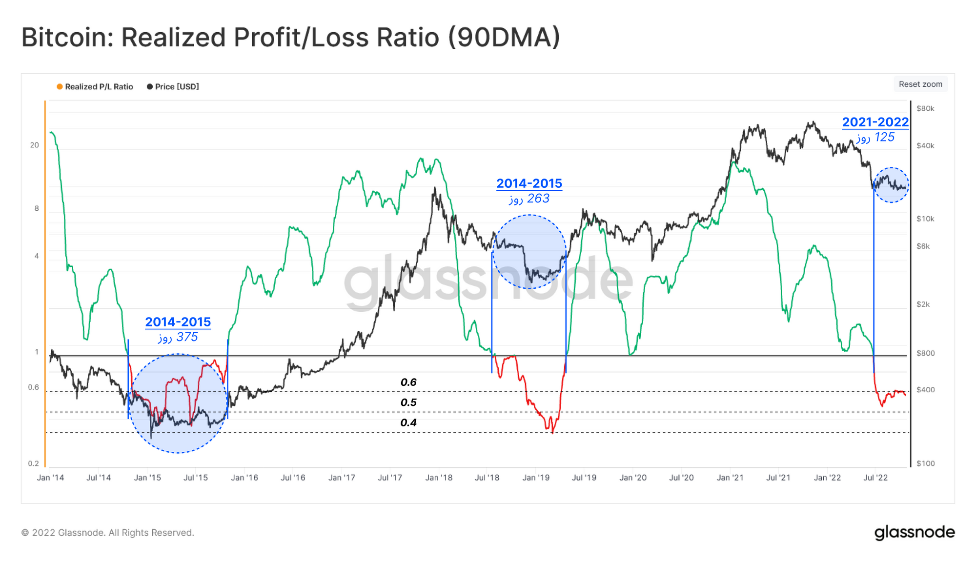 فشار مالی که قیمت در طول زمان به سرمایهگذاران وارد کرده ، اکنون توسط بازار پذیرفته شده است. این برای بازار نشانهای مثبت است؛ اما قبل از گذر نهایی از فاز خرسی به فاز صعودی، ضررهای نقدشده نسبی سالانه، باید روند نزولی پیدا کند.