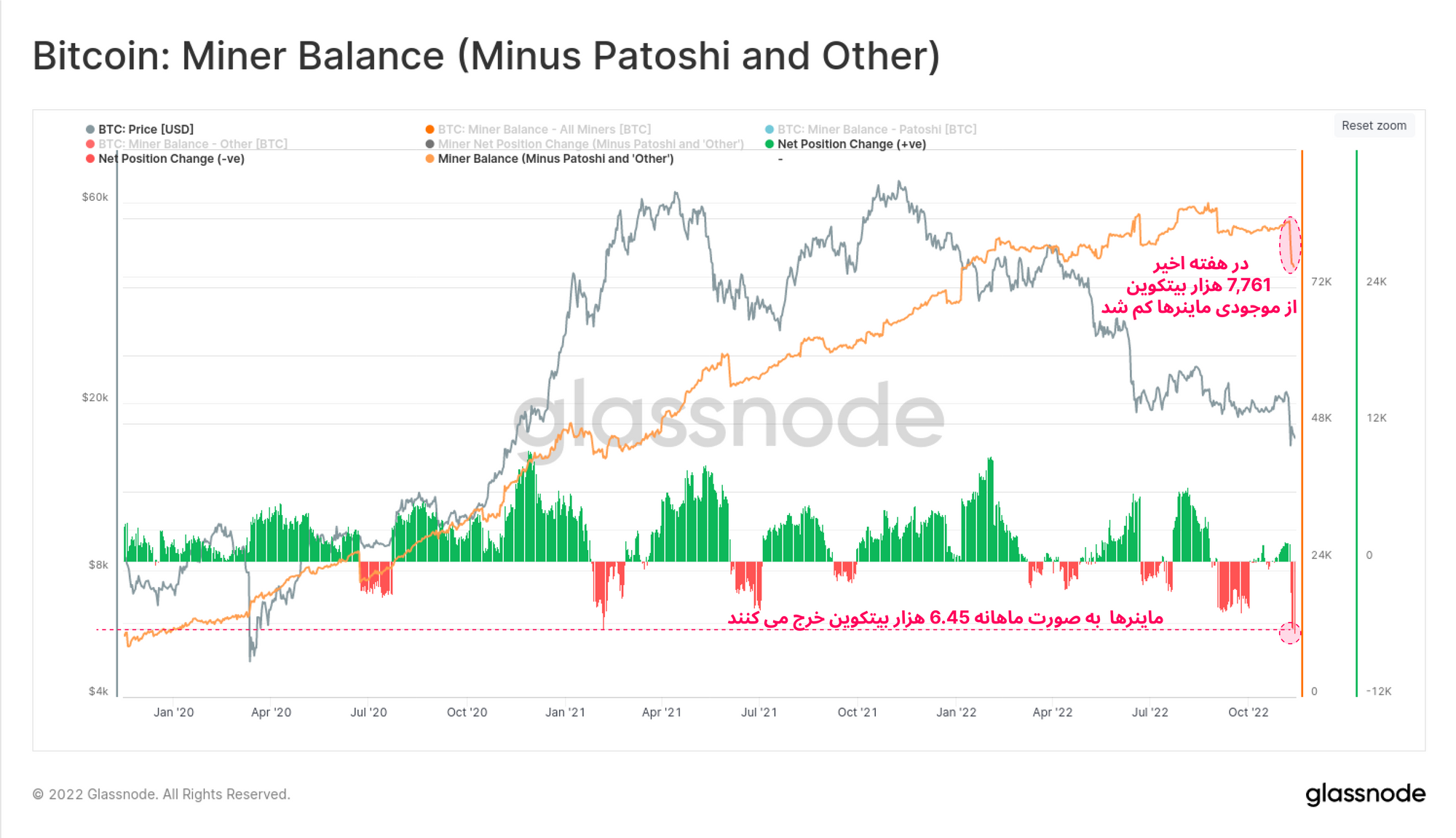 اکنون به تغییر میزان موجودی بیتکوین ماینرها می پردازیم. ماینرها قبل ازوقوع تمام این رخدادها به دلیل کاهش قیمت بیتکوین به مقدار کافی تحت فشار قرار داشتند. اکنون در حالی که درآمد ماینرها به پایینترین مقدار خود رسیده، مجبور به خرج کردن ۷.۷۶ هزار بیتکوین (حدود ۹.۵ درصد از موجودی) از ذخایر خود شدند. از سپتامبر ۲۰۱۸، به صورت ماهیانه این سنگینترین سقوط موجودی ماینرها بود که نشان از هماهنگی رفتار ماینرها با شرایط متفاوت بازار دارد.