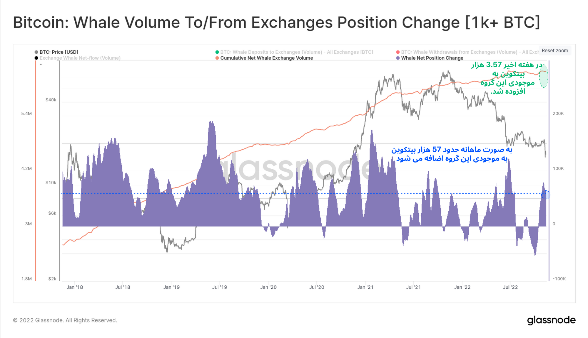 اکنون موجودی نهنگها (افرادی که بیش از ۱۰۰۰ بیتکوین دارند) را بررسی میکنیم. با این تفاوت که در نمودار زیر برخلاف نمودارهای قبل، صرفاً بیتکوینهایی که مستقیماً از صرافیها خارج شده و به آن وارد شده باشند، نمایش داده شده است. با این روش، فعالیت و جابهجایی سرمایه این نهادهای بزرگ بسیار بهتر نشان داده میشود. طبق این نمودار نهنگها در طول هفتههای اخیر به صورت ماهیانه ۵۳.۷ هزار بیتکوین به آدرسهای خود انتقال دادند.