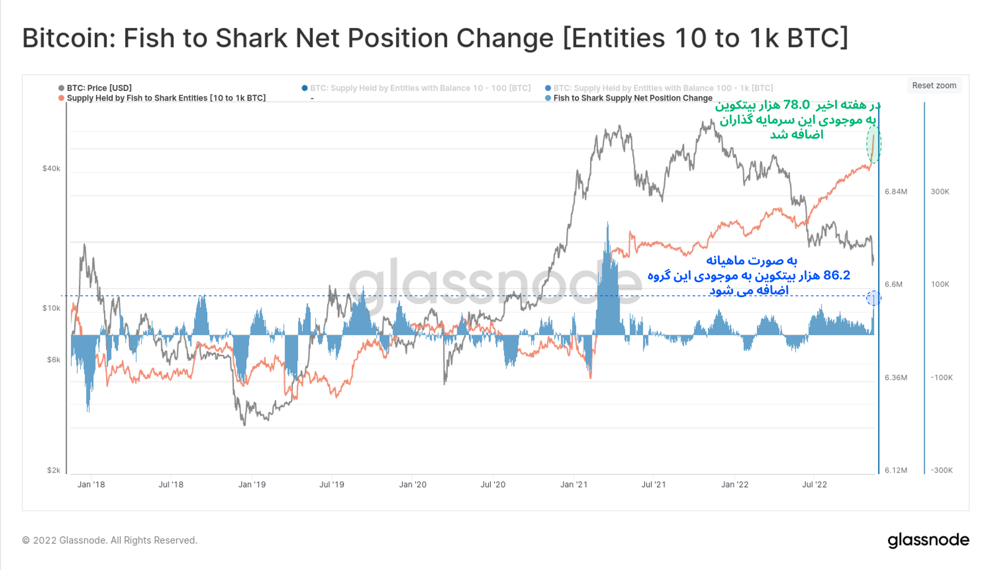 به سرمایهگذارانی که بین ۱۰ تا ۱۰۰۰ بیتکوین دارند، به ترتیب گروه های ماهی و کوسه گفته میشود. این گروه از سرمایهگذاران، نهادهای ثروتمند، نهادهای معاملاتی و سرمایهگذاران سازمانی هستند. در چندین ماه اخیر به تدریج انباشت قابلتوجهی داشتند که سرانجام در این هفته به میزان ۷۸ هزار بیتکوین به موجودی بیتکوین خود افزودند؛ به طوری که یکی از سنگینترین انباشت هفتگی این گروه را شاهد بودیم.به علت شرایط حساس و احتمال در خطر افتادن سرمایهی این گروه، مانند گروههای دیگر سریعاً دارایی خود را از صرافیها خارج کردهاند.