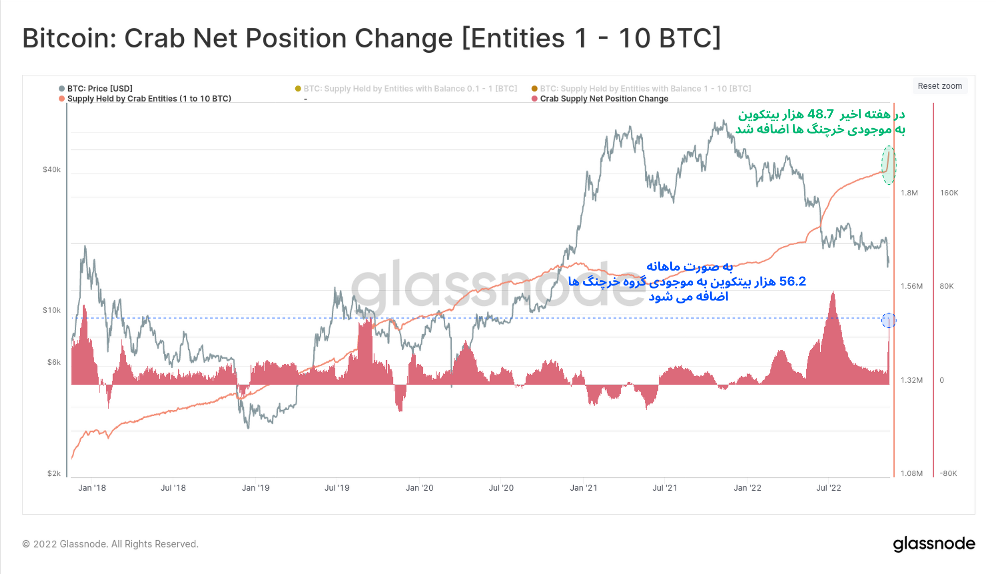 گروه خرچنگها (افرادی که بین ۱ تا ۱۰ بیتکوین دارند) نیز به همین شدت بیتکوینهای خود را به آدرس های شخصی خود منتقل میکنند. این گروه تاکنون ۴۸.۷ هزار بیتکوین از صرافیها خارج کرده و به آدرس های شخصی خود ارسال کردند. در حال حاضر شدت انباشت این گروه به میزان انباشت در فاز صعودی ۲۰۱۷ میرسد. به طور کلی دارایی سرمایهگذارانی که کمتر از ۱۰ بیتکوین دارند، ۱۵.۱۳ درصد بیتکوینهای در گردش بازار را تشکیل میدهد.