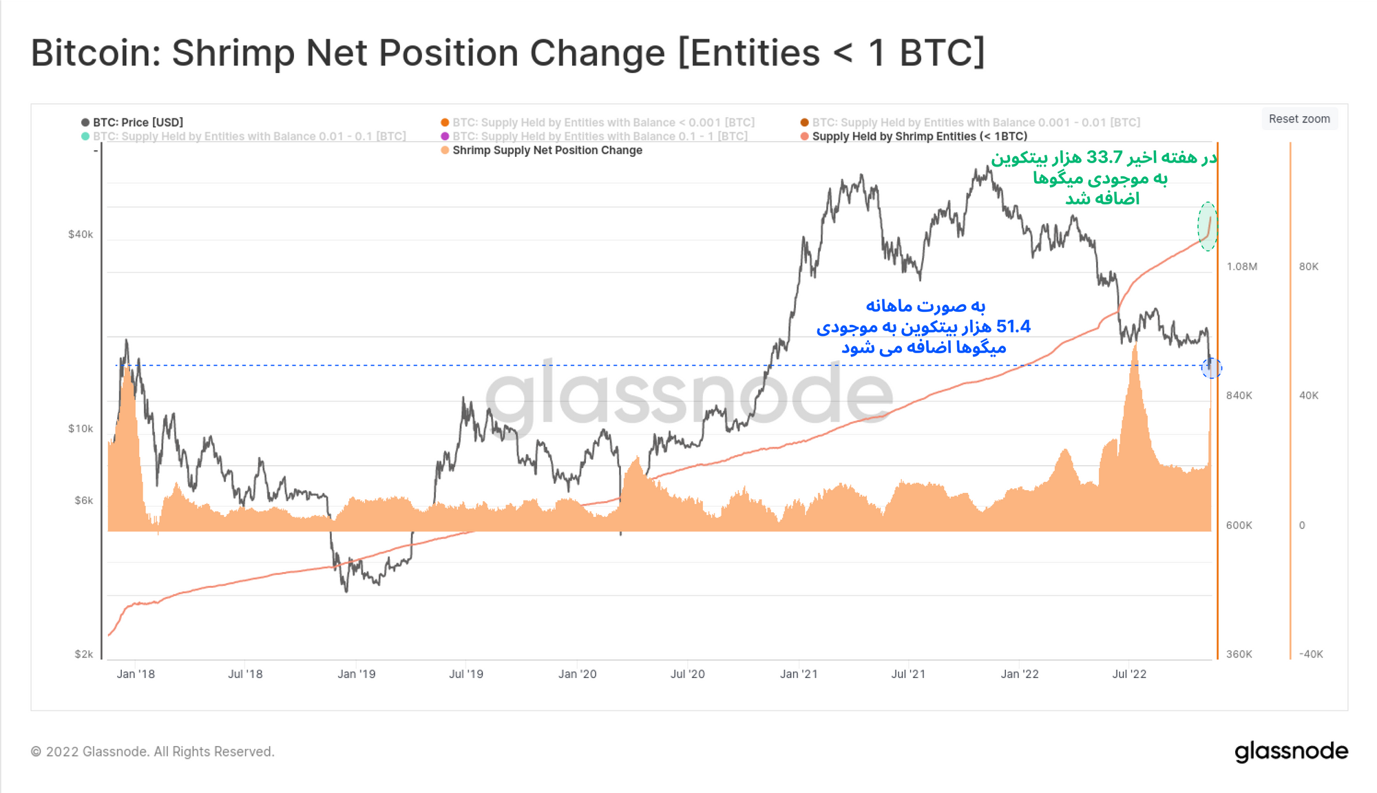 گروه میگوها (سرمایهگذارانی که دارای کمتر ار یک بیتکوین هستند)، تنها در هفته گذشته، ۳۳.۷ هزار بیتکوین به آدرسهای شخصی و به طور کلی به موجودی خود اضافه کردند. در حال حاضر این گروه با انباشت و افزایش موجودی اخیر، رکورد انباشت خود را در فاز صعودی ۲۰۱۷ شکسته است.