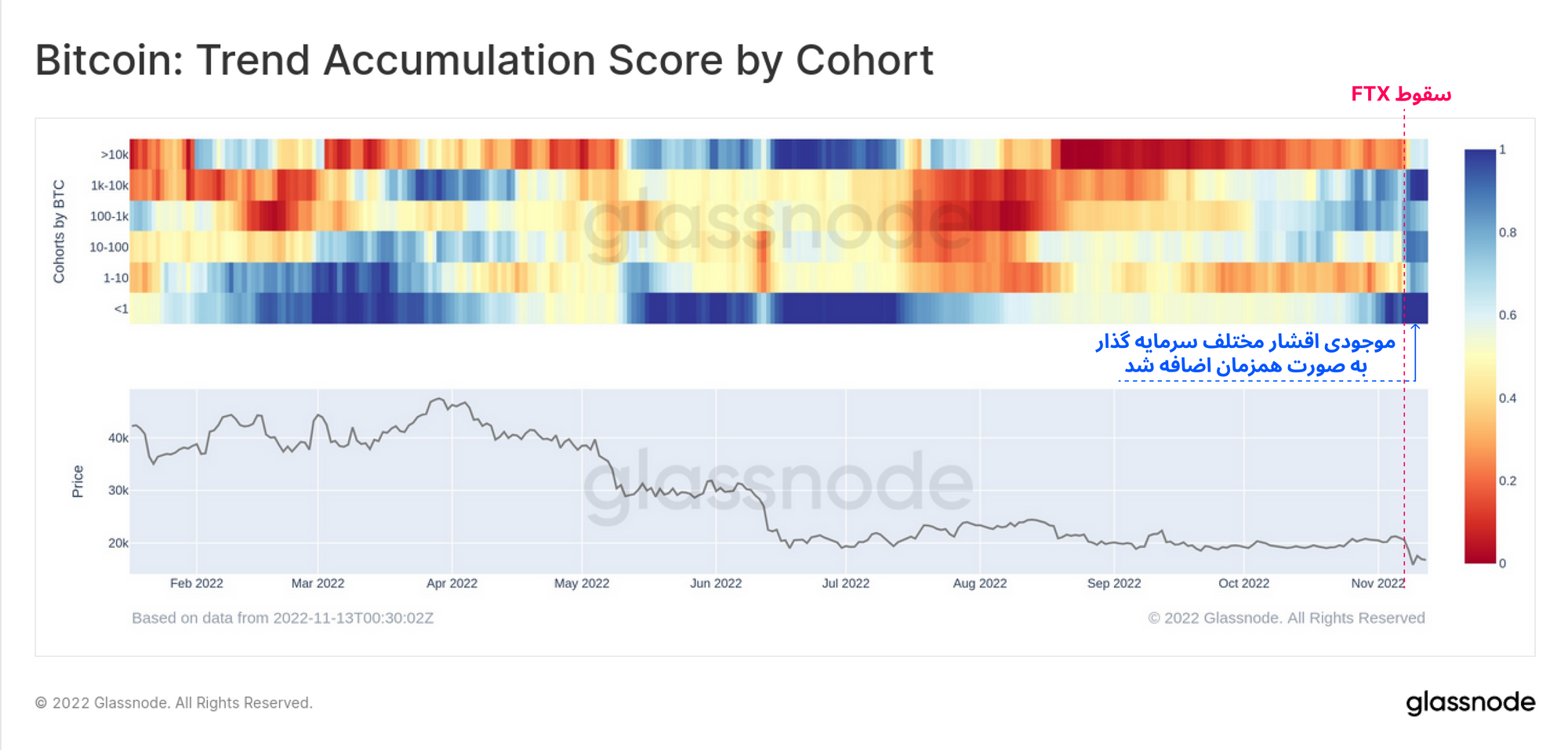 در معیارهای قبل مشاهده کردیم که بیتکوین با حجم و سرعت بسیار چشمگیری از صرافیها خارج شده است. اکنون در نمودار زیر مشاهده میکنیم که پس از حادثه سقوط صرافی FTX، گروههای مختلف سرمایهگذار، پس از خارج کردن بیتکوین های خود از صرافی ها، آن را به کیفپولهای خود منتقل کردند؛ به طوری که تغییر رفتار تمام سرمایهگذاران قبل و بعد از این حادثه بسیار مشهود است. از سرمایهگذارانی که دارای کمتر از یک بیتکوین بودند تا افراد دارای بیش از هزار بیتکوین، موجودی تمام این گروه ها پس از سقوط FTX به طرز چشگیری افزایش پیدا کرد. حتی رفتار برخی از این گروهها نسبت به قبل از این حادثه، ۱۸۰ درجه تغییر پیدا کردهاست.