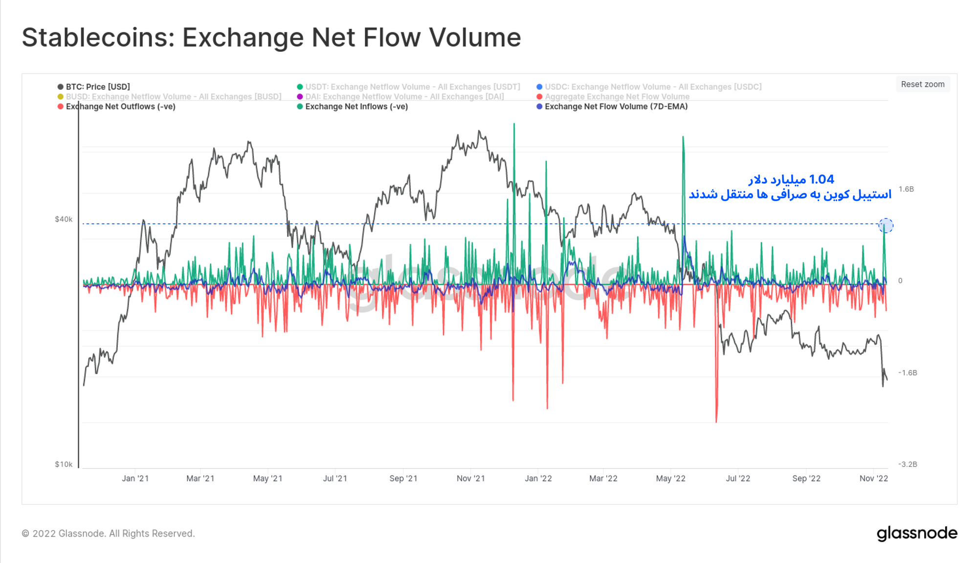 با وجود اینکه سرمایهگذاران اتریوم و بیتکوینهای خود را به سرعت از صرافیها خارج میکنند، به همان سرعت استیبلکوینهای خود را به صرافیها منتقل میکنند. در تاریخ دهم نوامبر، سرمایهگذاران به میزان ۱.۰۴ میلیارد دلار از انواع استیبلکوینها مانند USDT، USDC، BUSD و DAI به صرافیها منتقل کردند. این تاریخ در بین سنگینترین حجم ورودی استیبلکوین به صرافیها ، در رتبهی هفتم قرار میگیرد.