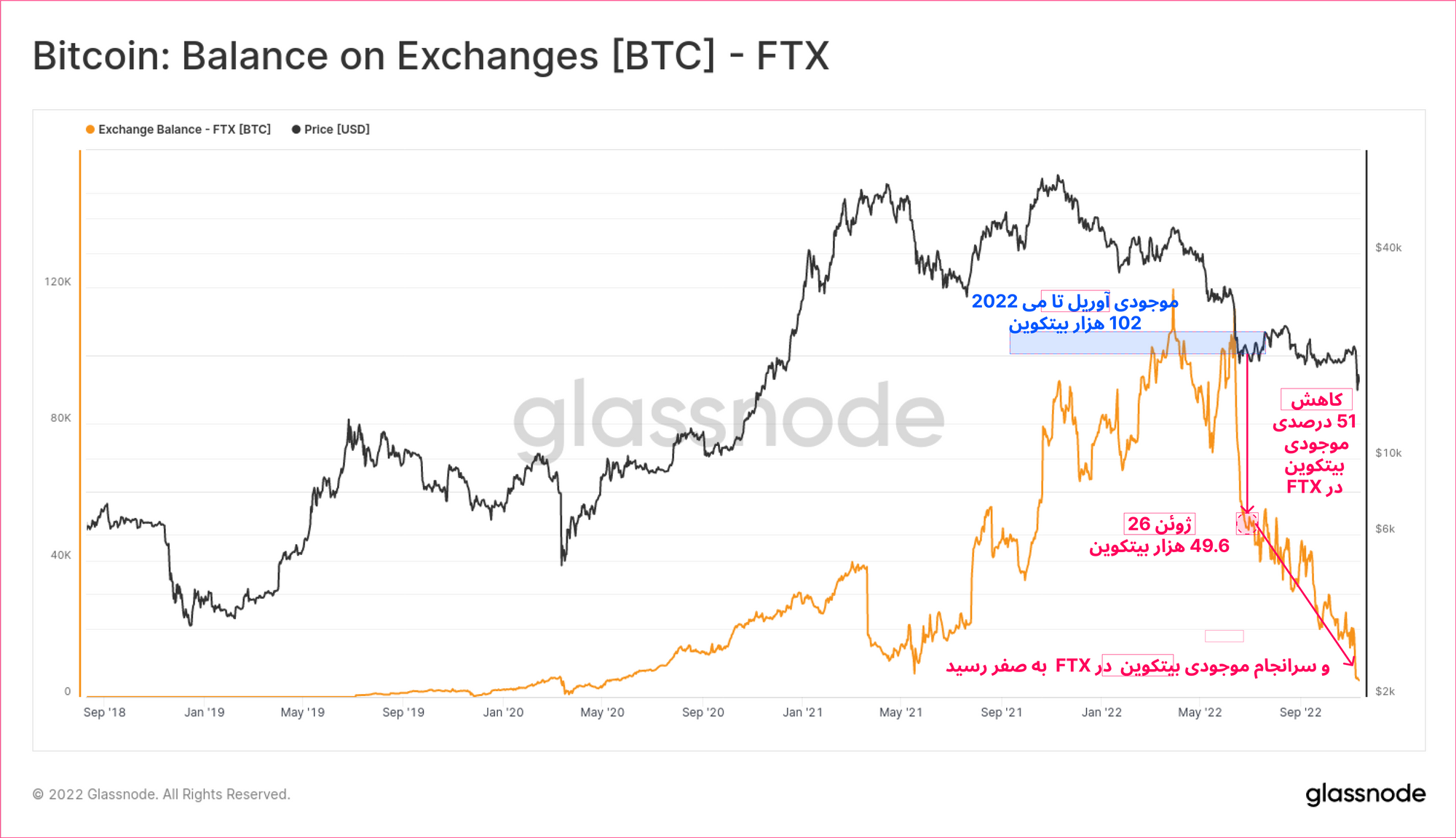طی هفته گذشته ذخایر بیتکوین FTX به طور پیوسته کاهش داشت تا سرانجام سرمایهگذاران تمام ذخایر بیتکوین را به طور کامل از این صرافی خارج کردند.تا کنون طبق شواهدی Alameda در اختلاس سرمایه کاربران FTXدست داشته است. به همین جهت طبق نمودار زیر میتوان گفت مشکلات مالی Alameda و FTX از ماه می تا ژوئن، به عبارتی پس از سقوط LUNA ، 3AC و نهادهای دیگر، آغاز شده بود.