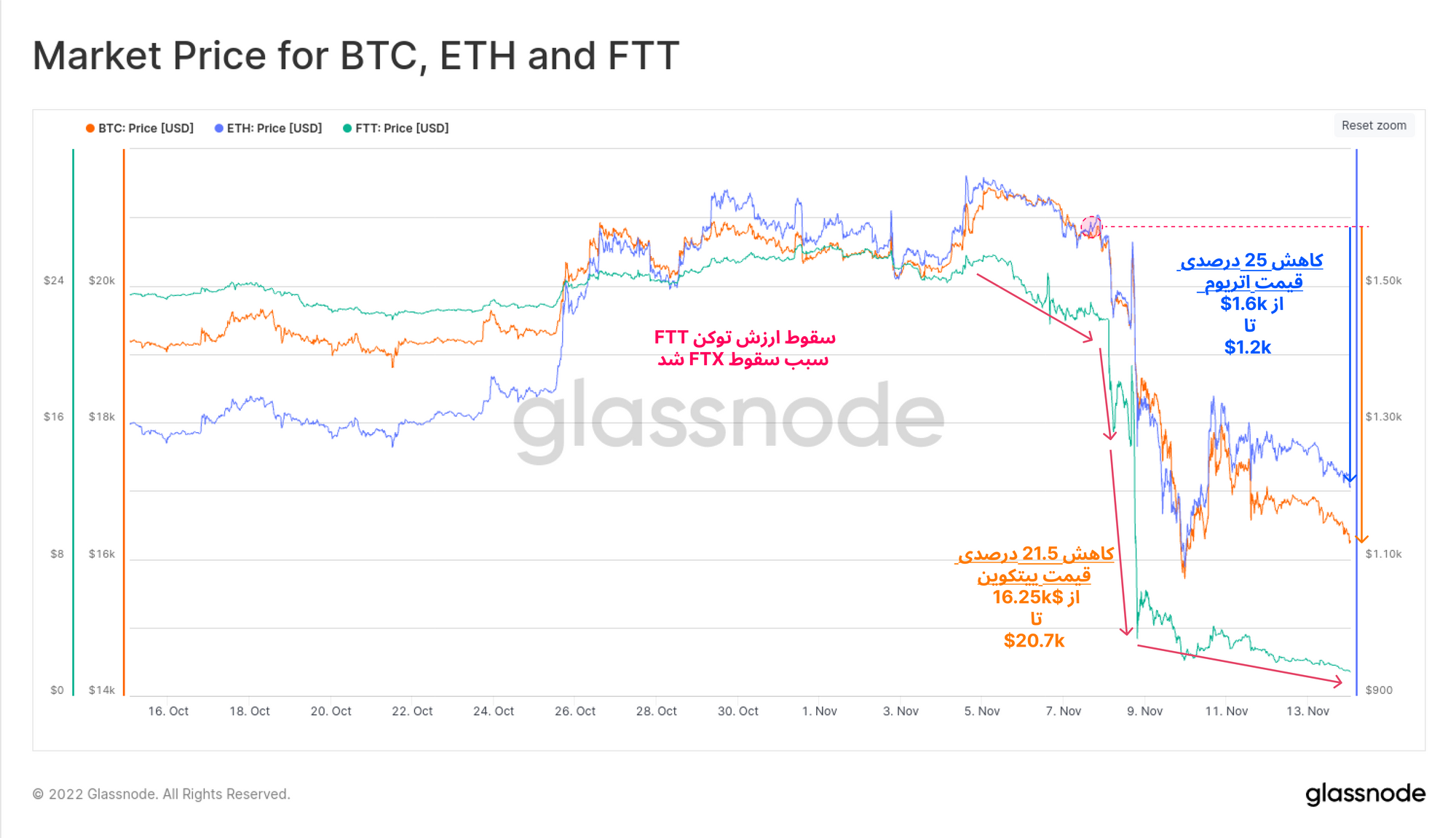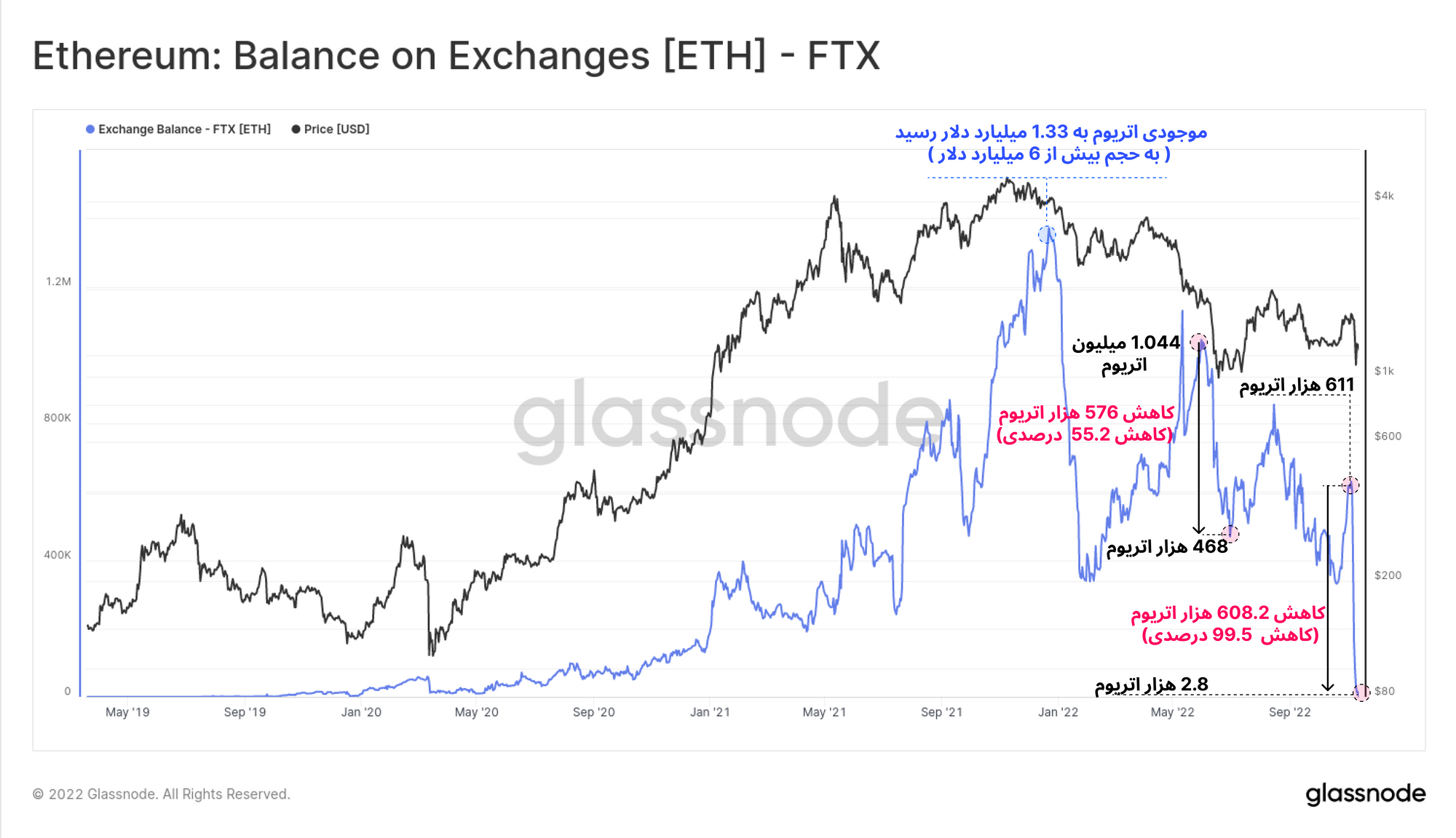 موجودی اتریوم صرافی FTX نیز مانند موجودی بیتکوین به همین صورت کاهش داشت تا زمانی که ذخایر اتریوم به طور کامل از این صرافی خارج شد.