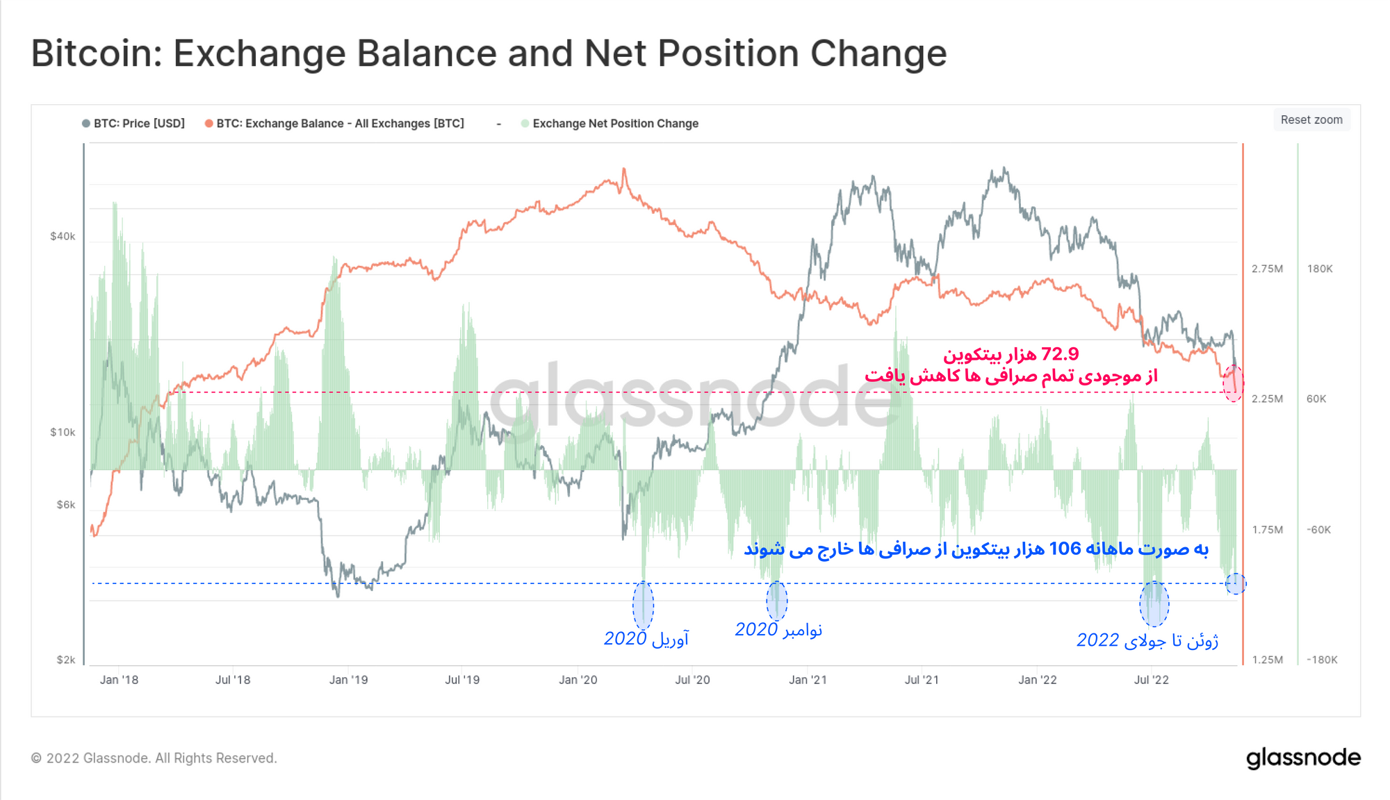 طی ۷ روز گذشته، موجودی بیتکوین صرافیها حدود ۷۲.۹ هزار بیتکوین کاهش پیدا کرد و یکی از سنگینترین خروجیهای بیتکوین از صرافیها را رقم زد؛ به طوری که بازار در گذشته تنها سه مرتبه چنین حجم خروجی را از صرافیها تجربه کرده بود؛ در آوریل ۲۰۲۰، نوامبر ۲۰۲۰ و ژوئن تا جولای ۲۰۲۲.