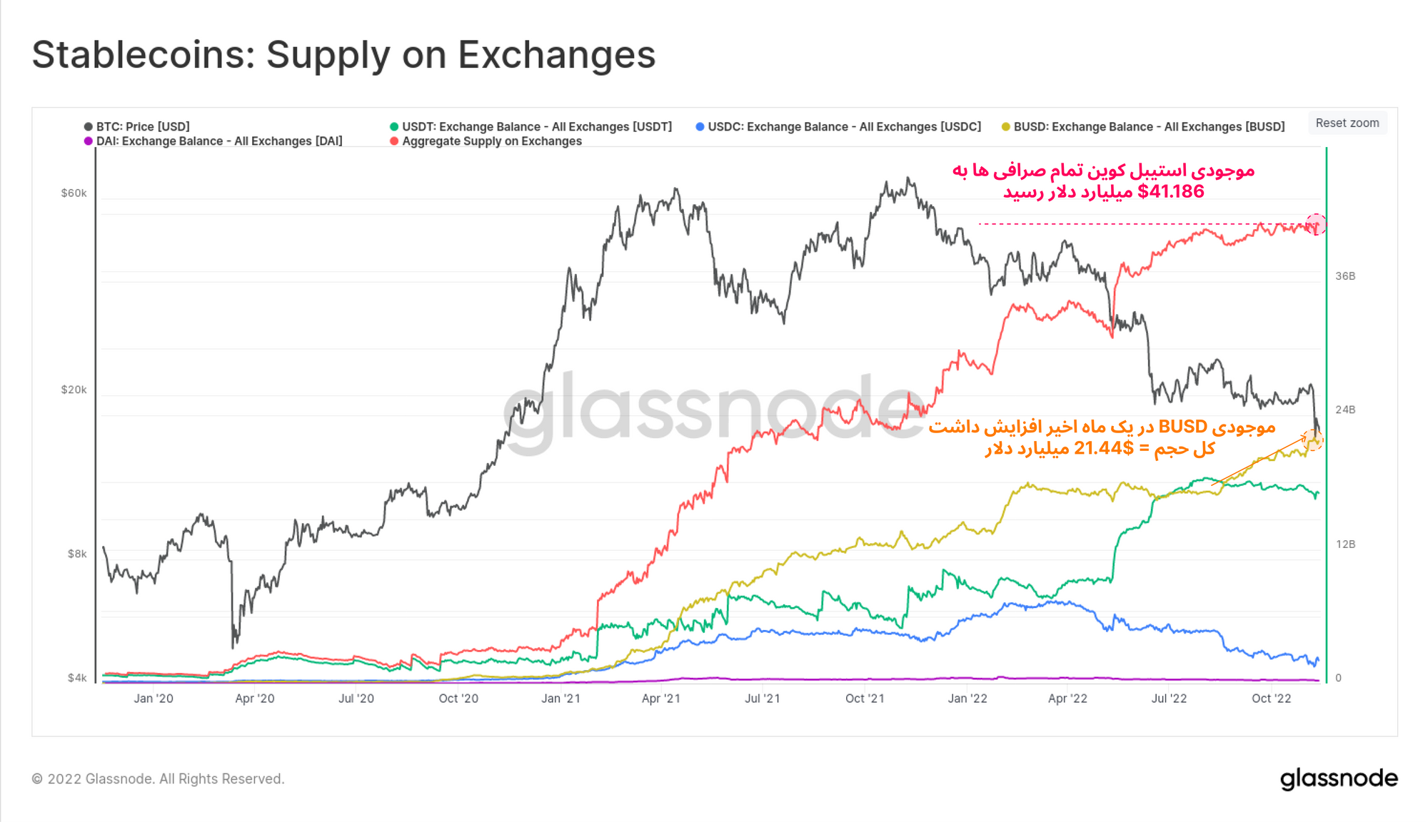 سرمایهگذاران با واریز استیبلکوینهای خود به صرافی ها، موجودی استیبلکوین تمام صرافیها را به حجم ۲۱.۴۴ میلیارد دلار رساندند ؛به طوری که مجموع حجم استیبلکوین در تمام صرافی ها ATH جدیدی را ثبت کرد. همچنین در نمودار زیر مشاهده میکنیم که در دو ماه اخیر موجودی BUSD افزایش پیدا کرده است و مجموعا ۲۱.۴۴ میلیارد دلار BUSD در تمام صرافی ها نگهداری میشود.یکی از دلایل افزایش موجودی BUSDدر صرافیها میتواند، افزایش سهم Binance در میزان استیبلکوینها، به عنوان بزرگترین صرافی دیجیتال میان دیگر صرافیها باشد.