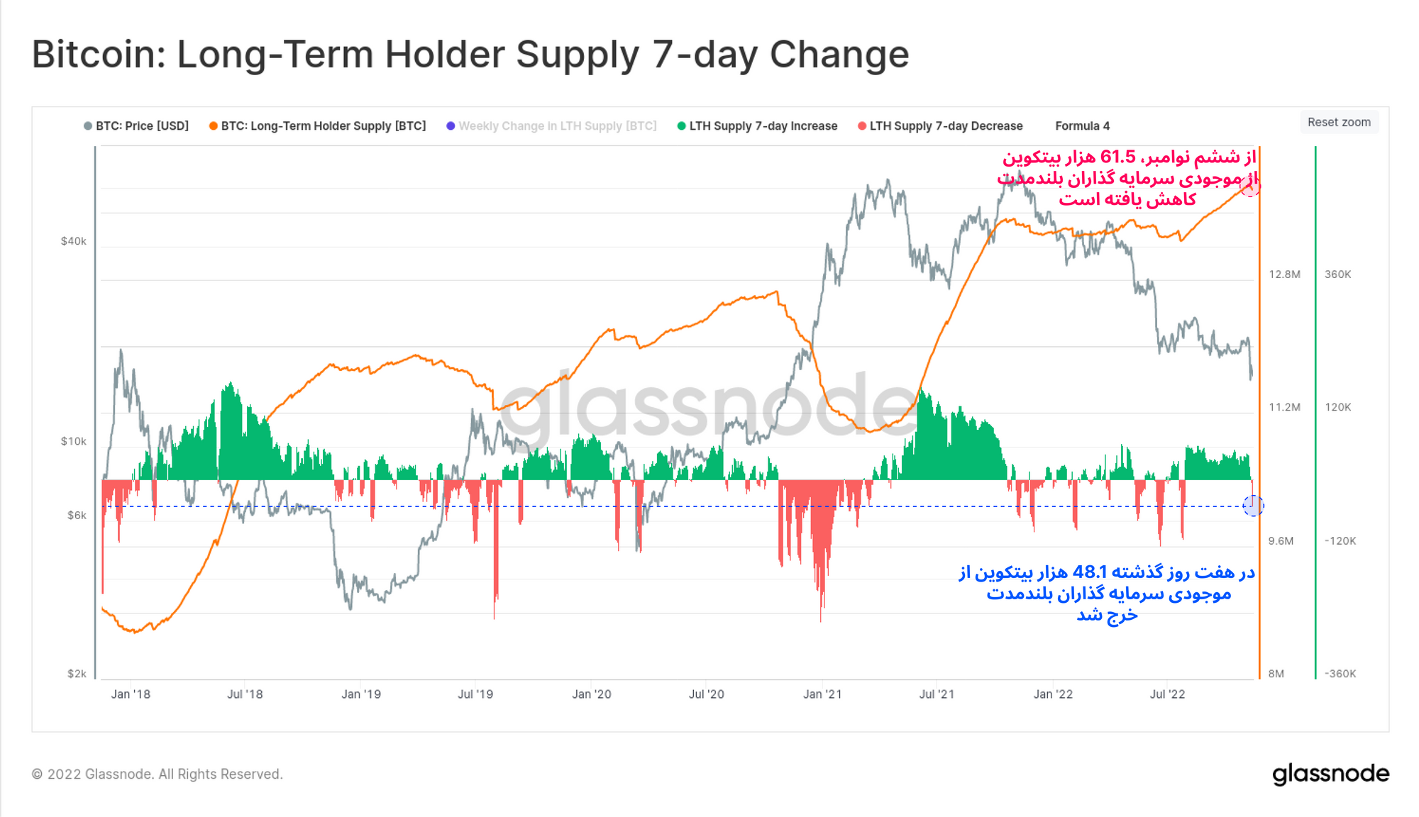 هولدرهای بلندمدت سرمایهگذارانی هستند که به لحاظ آماری بیتکوینهای خود را کمتر خرج میکنند. در حال حاضر از ششم نوامبر ۶۱.۵ هزار بیتکوین از موجودی این سرمایهگذاران کاهش یافته و طی هفته گذشته ۴۸.۱ هزار بیتکوین از موجودی آنها خرج شده که بسیار قابل توجه است.