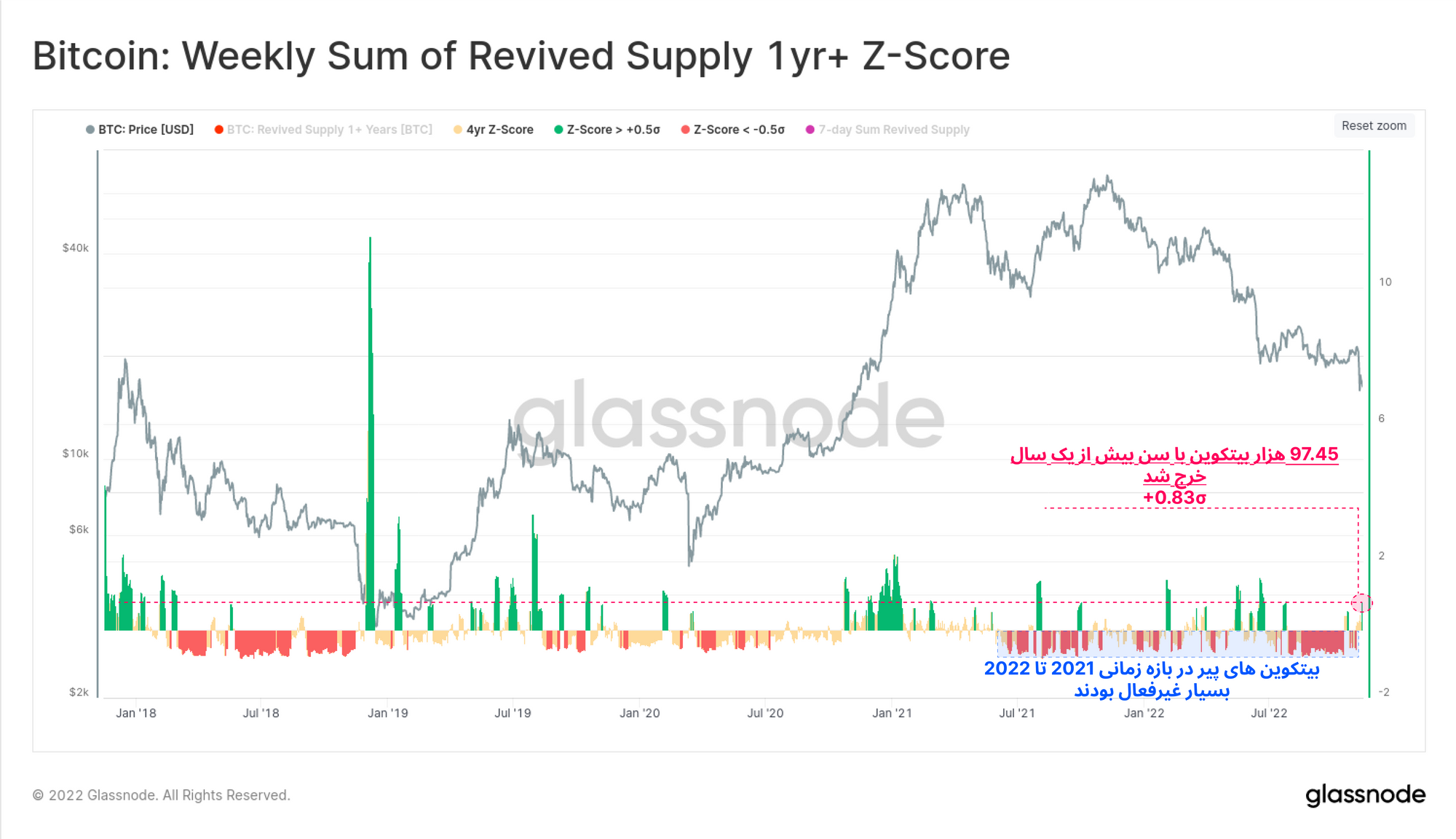 نمودار زیر نشان میدهد که به صورت میانگین هفتگی چه میزان از بیتکوینهایی که بیش از یک سال عمر داشتند، خرج شدند. طی هفته گذشته ۹۷.۴۵ هزار بیتکوین که بیش از یک سال سن داشتند، خرج شده و دوباره به چرخه فعال بازار بازگشتند.
