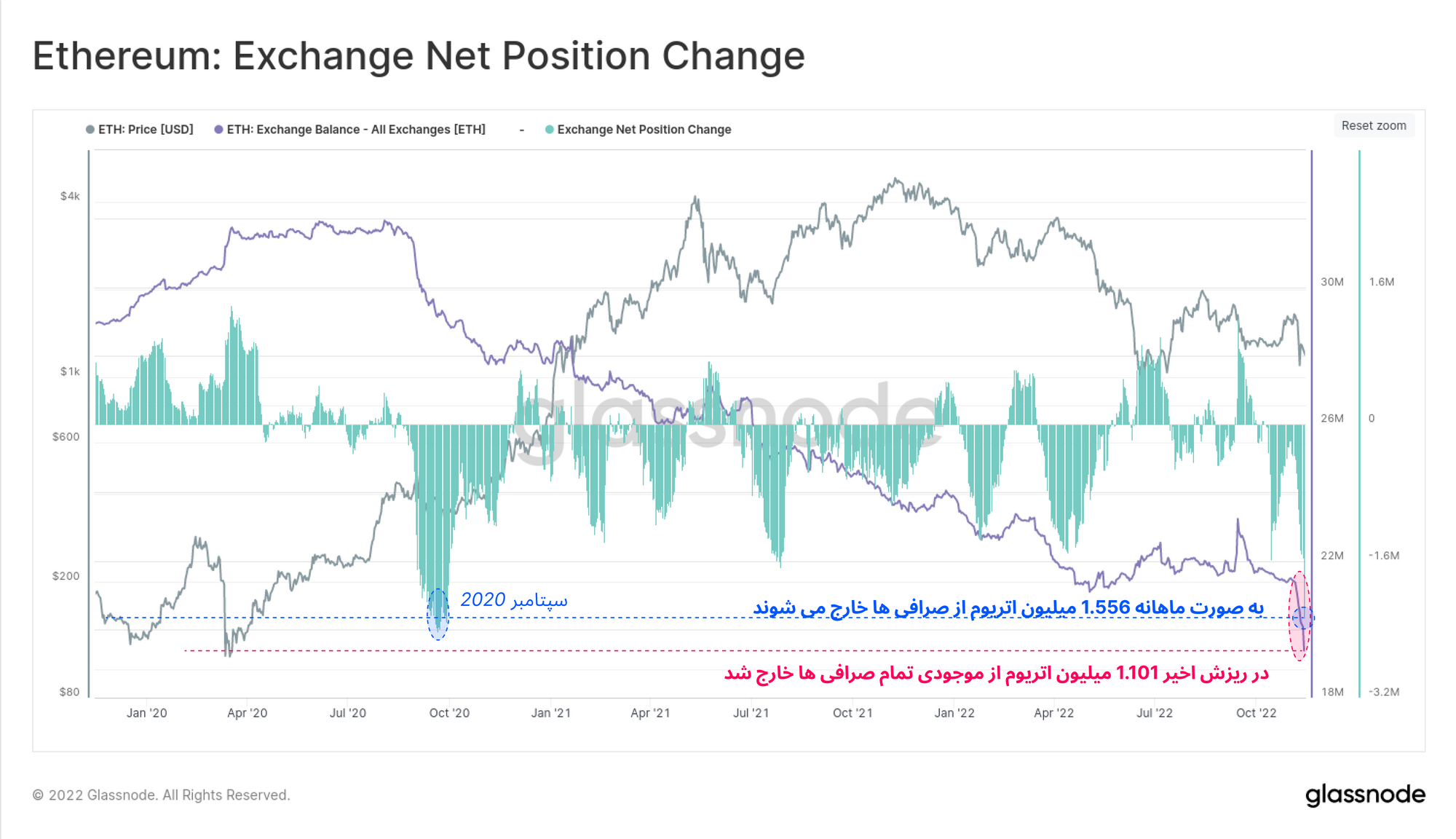 در نمودار زیر برای موجودی اتریوم صرافیها نیز وضعیت مشابهی را مشاهده میکنیم. در طول هفته گذشته حدود ۱.۱۰۱ میلیون اتریوم از صرافیها خارج شد. سپتامبر ۲۰۲۰ به 'تابستان Defi' معروف است که در این بازه زمانی تقاضا برای اتریوم به اوج خود رسیده بود و سرمایهگذاران برای استفاده از اتریوم به عنوان وثیقه قراردادهای هوشمند، اتریومها را از صرافیها خارج میکردند. پس از سپتامبر ۲۰۲۰، حجم اتریومهایی که اخیرا از صرافیها خارج شده، سنگینترین خروجی اتریوم از صرافیهاست.