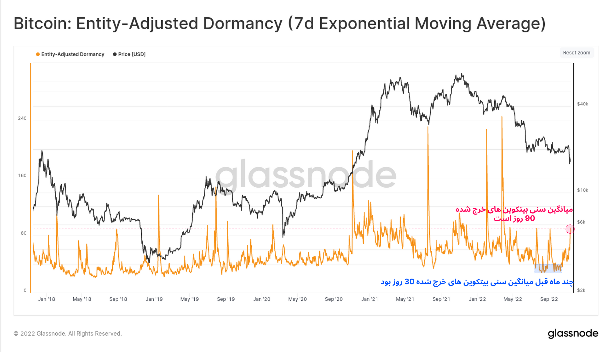 نمودار زیر میانگین عمر بیتکوینهایی که اکنون در حال خرج شدن هستند نشان میدهد. در حال حاضر در این هفته، میانگین سنی بیتکوینهایی که خرج شدند، به بالای ۹۰ روز رسیده و از بازه زمانی سپتامبر تا اکتبر امسال که بازار بسیار کمنوسان بود، سه برابر شده است. بالارفتن میانگین سنی بیتکوینهای خرجشده حائز اهمیت است و اکنون میانگین سنی بیتکوینهای خرج شده به اندازه تسلیم بازار در سقوط قیمت چرخههای قبل و حتی اوج برداشت سود از بازار صعودی ۲۰۲۱، افزایش پیدا کرده است.