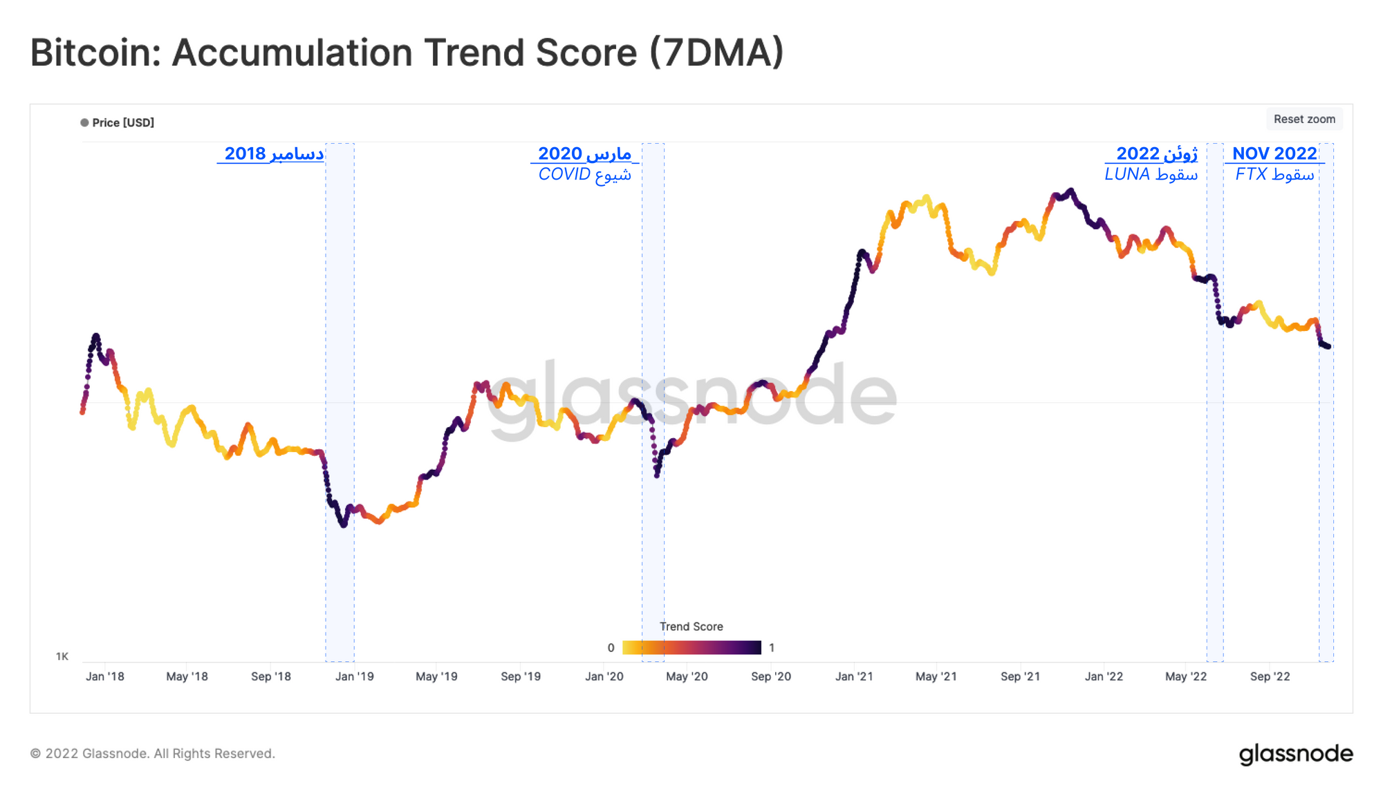 قیمت بیتکوین تاکنون به مدت چهار و نیم ماه زیر سطح Realized Price (میانگین آخرین قیمت خرید یا جابهجایی تمام سرمایهگذاران) قرار دارد. در گذشته هر زمانی که قیمت برای مدت زمان قابلتوجهی زیر این سطح قرار گرفته، بازار در حال تلاش برای کفسازی قیمت بوده است. اکنون با استفاده از معیار Accumulation Trend Score میتوان مرحله کفسازی بازار را بهتر نشان داد.