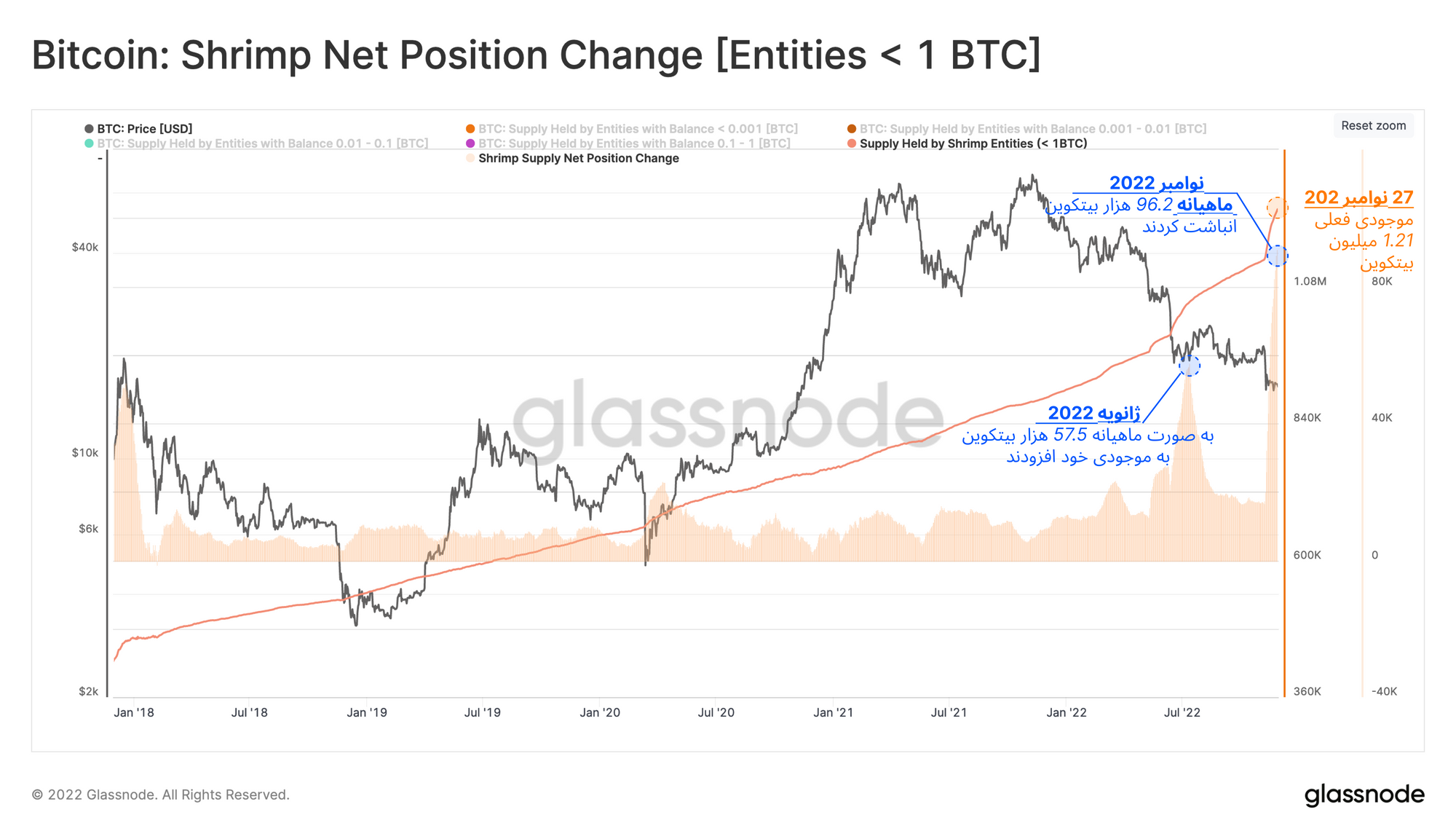 میان تمام گروههای مختلف، میزان موجودی سرمایهگذارانی که دارای کمتر از ۱ بیتکوین هستند (این گروه، میگو نامگذاری شده است)، در پنج ماه اخیر دو مرتبه به بالاترین حد خود رسیده است. این گروه از زمان سقوط صرافی FTX تاکنون ۹۶.۲ هزار بیتکوین به موجودی خود افزوده است. اکنون مجموع ذخایر آنها ۱.۲۱ میلیون بیتکوین و معادل ۶.۳ درصد موجودی در گردش است.