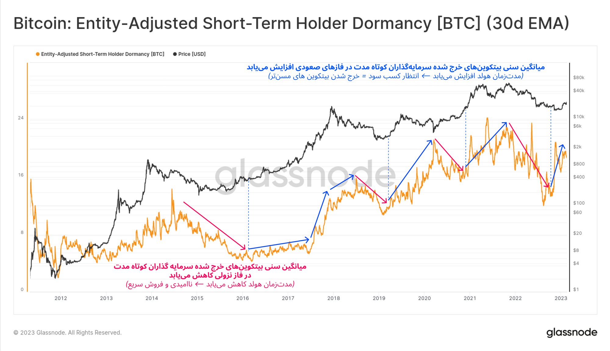 پیشنهاد تنظیم هشدار : درصورتی که معیار STH-Dormancy (30D-SMA)، از مرز ۱۷ روز کاهش قابلتوجهی داشته باشد، نشان از کاهش میانگین سنی بیتکوینها و احتمالا گسترش ترس و اضطراب در جو بازار است.