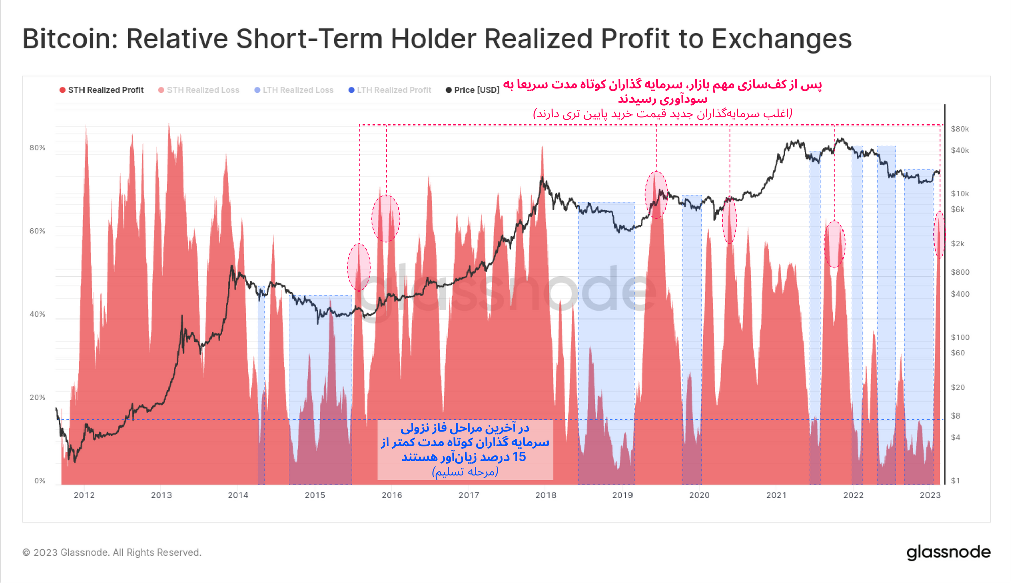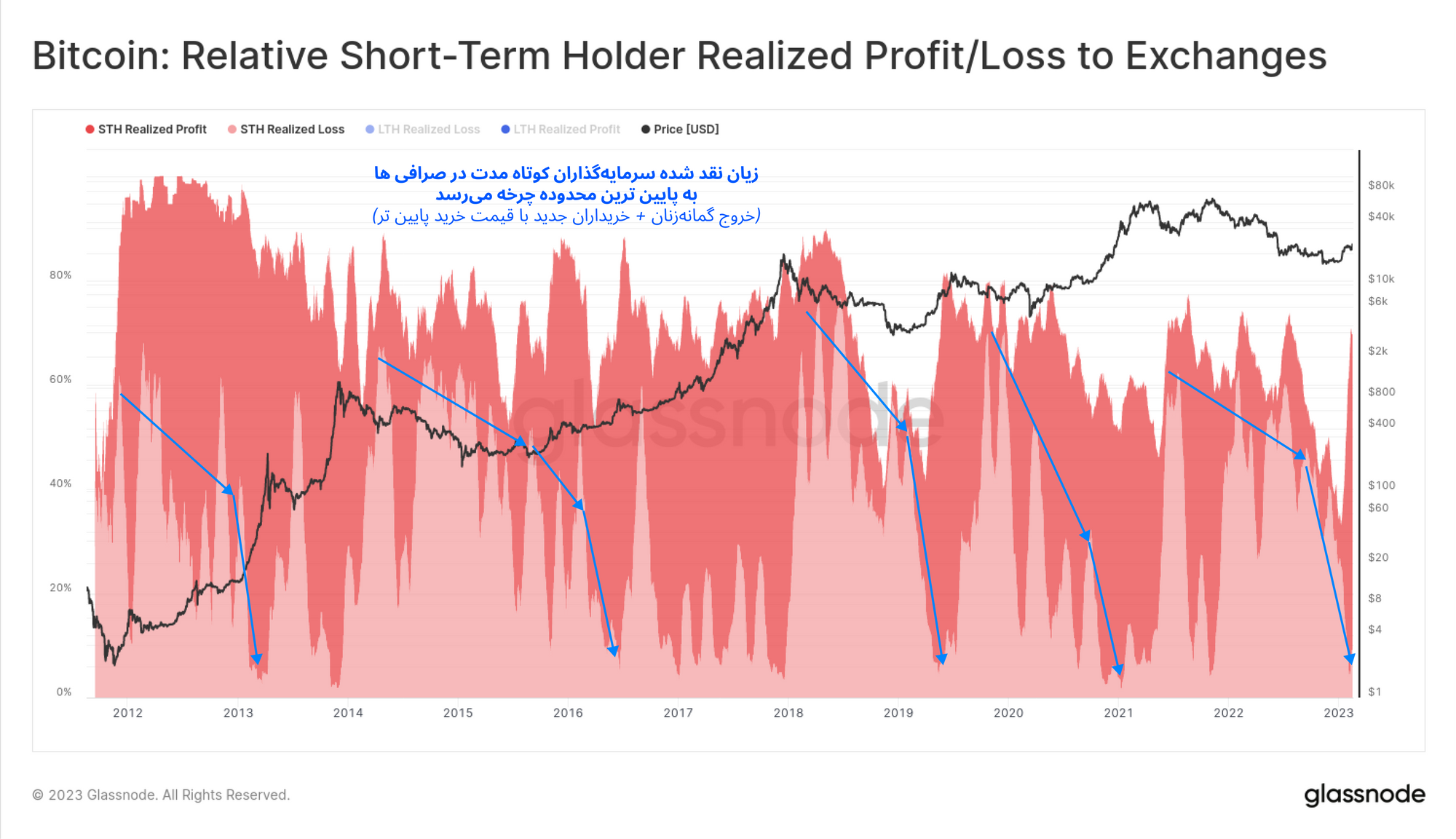 نمودار زیر درصد سود و زیانی که توسط سرمایهگذاران کوتاهمدت نقد شده است، مشخص میکند. باید توجه داشت که این نمودار صرفاً درصد سود و زیان بیتکوینهایی را نشان داده است که به صرافیها منتقل شدهاند؛ تا از این طریق، تخمین دقیقتری از فشار فروش بازار ارائه شود.