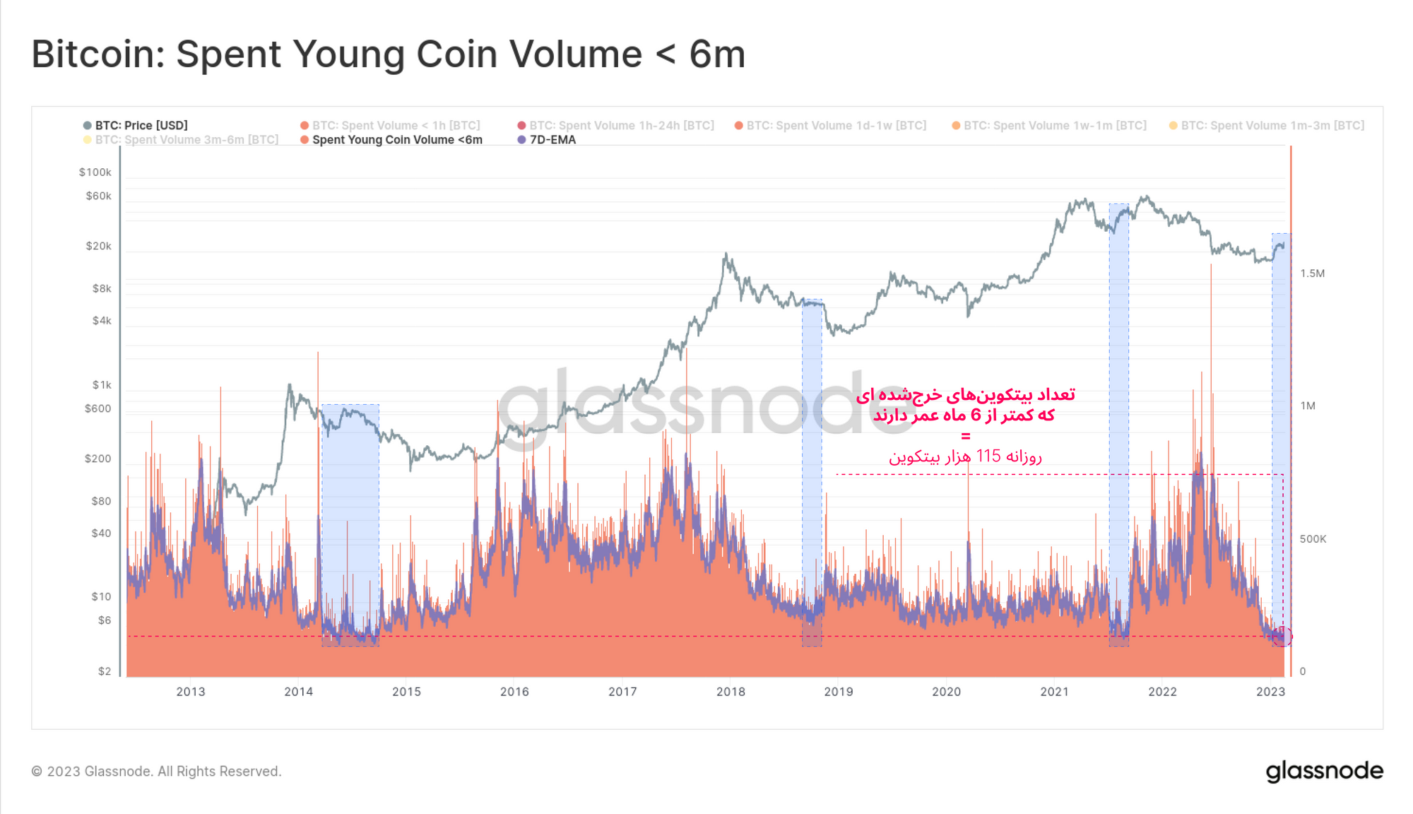 نمودار زیر حجم بیتکوینهایی که با سن کمتر از شش ماه خرج شدهاند، مشخص میکند. همانطور که مشاهده میکنید، علیرغم رشد قیمت، حجم قابلتوجهی از بیتکوینهای جوانتر از شش ماه در شبکه خرج نشده است. در حال حاضر روزانه حدود ۱۱۵ هزار بیتکوین جوانتر از شش ماه، در شبکه جابهجا میشوند. به عبارتی حجمی که اخیرا توسط این گروه سنی خرج شده، به مقداری کاهش یافته است که در تاریخچه بیتکوین تنها در چند نمونه همانند مورد فعلی شاهد چنین حجم ناچیزی از خرج شدن بیتکوینهای جوانتر از شش ماه بودهایم.
