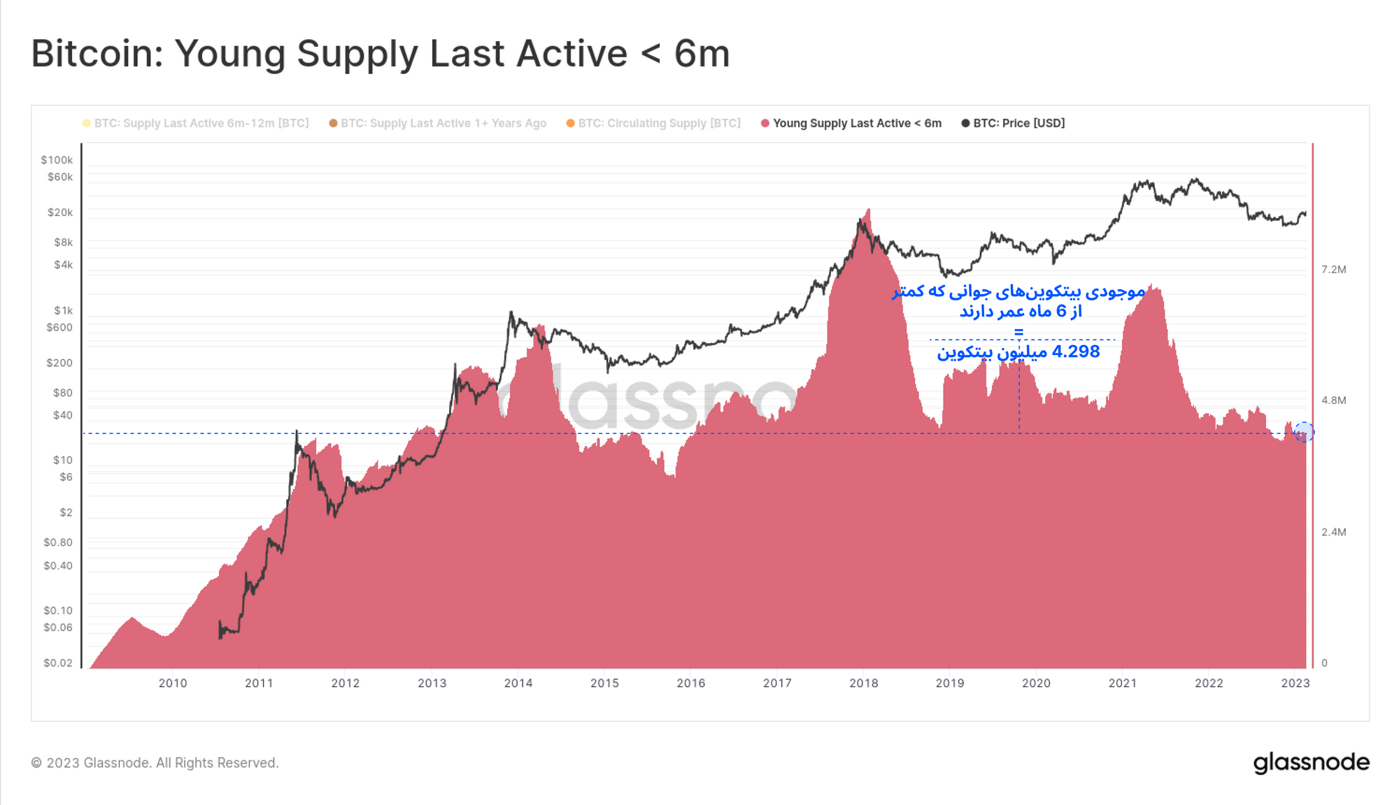 طبق نمودار، موجودی گروه سنی جوانتر از شش ماه حدود ۴.۲۹۸ میلیون بیتکوین است که از آغاز سال تاکنون افزایش قابلتوجهی در این موجودی مشاهده نمیکنیم. بنابراین از آنجایی که تغییری در موجودی بیتکوینهایی با عمر کمتر از شش ماه ایجاد نشده است، میتوان گفت بیتکوینهایی که دارای بیش از شش ماه عمر هستند نیز، در حال حاضر غیر فعال هستند و در گردش بازار حضور ندارند؛ زیرا تا زمانی که بیتکوینهای بلندمدت خرج نشوند، به موجودی بیتکوینهای کوتاهمدت نیز افزوده نخواهد شد.
