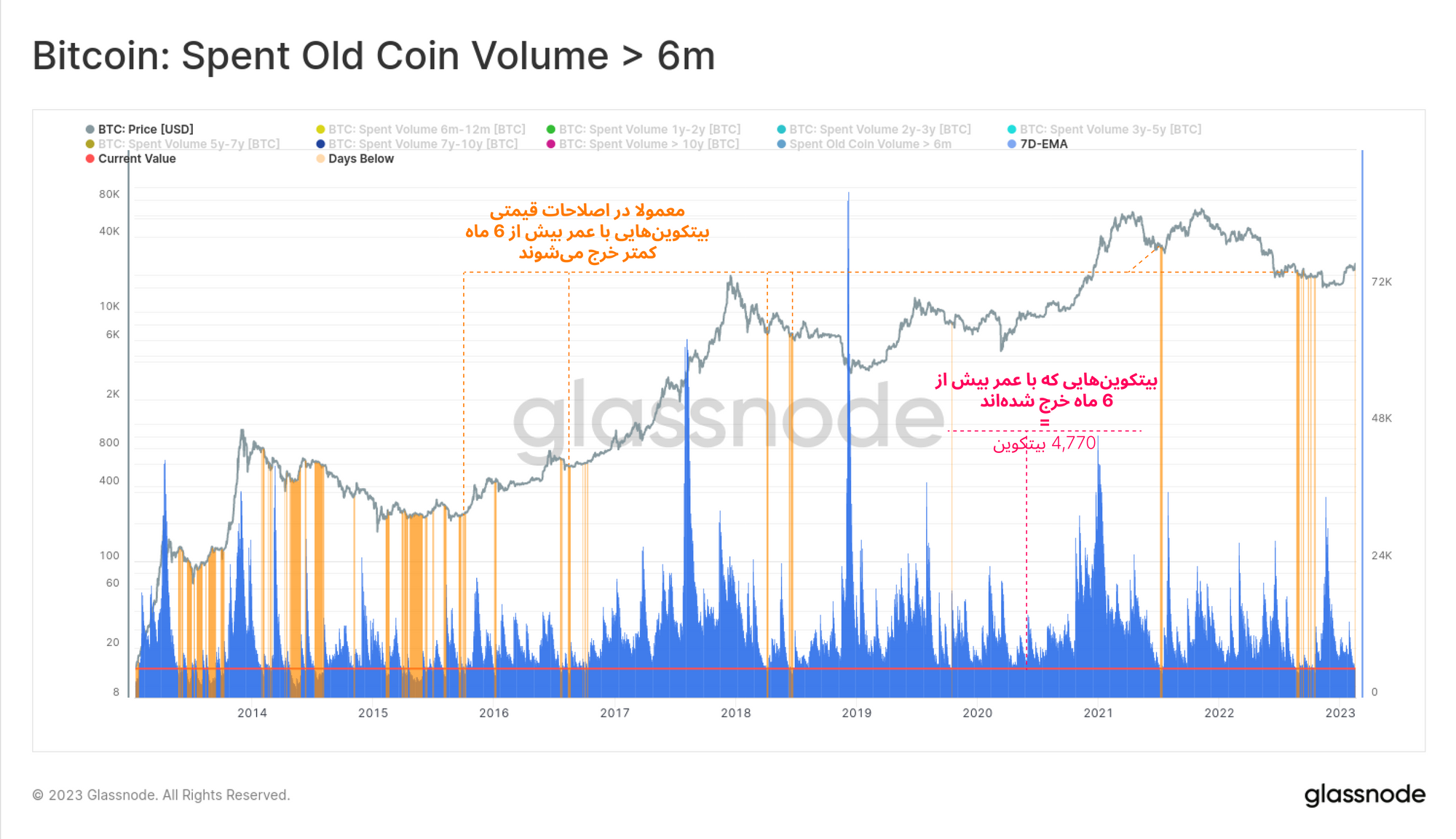 اکنون باید مشاهده کنیم که چه مقدار از بیتکوینهایی که بیش از شش ماه عمر دارند، اخیرا در حال جابهجایی بوده و یا خرج شدهاند. طبق نمودار زیر در این هفته به صورت روزانه، کمتر از ۴۷۷۰ از بیتکوینهای پیرتر از شش ماه جابهجا شده است. اگر به گذشته نمودار توجه کنیم، مواردی را خواهیم یافت که نسبت به وضعیت فعلی، تعداد بیتکوینهای کمتری از این گروه سنی در آن بازه زمانی، جابهجا شده است 🟠.