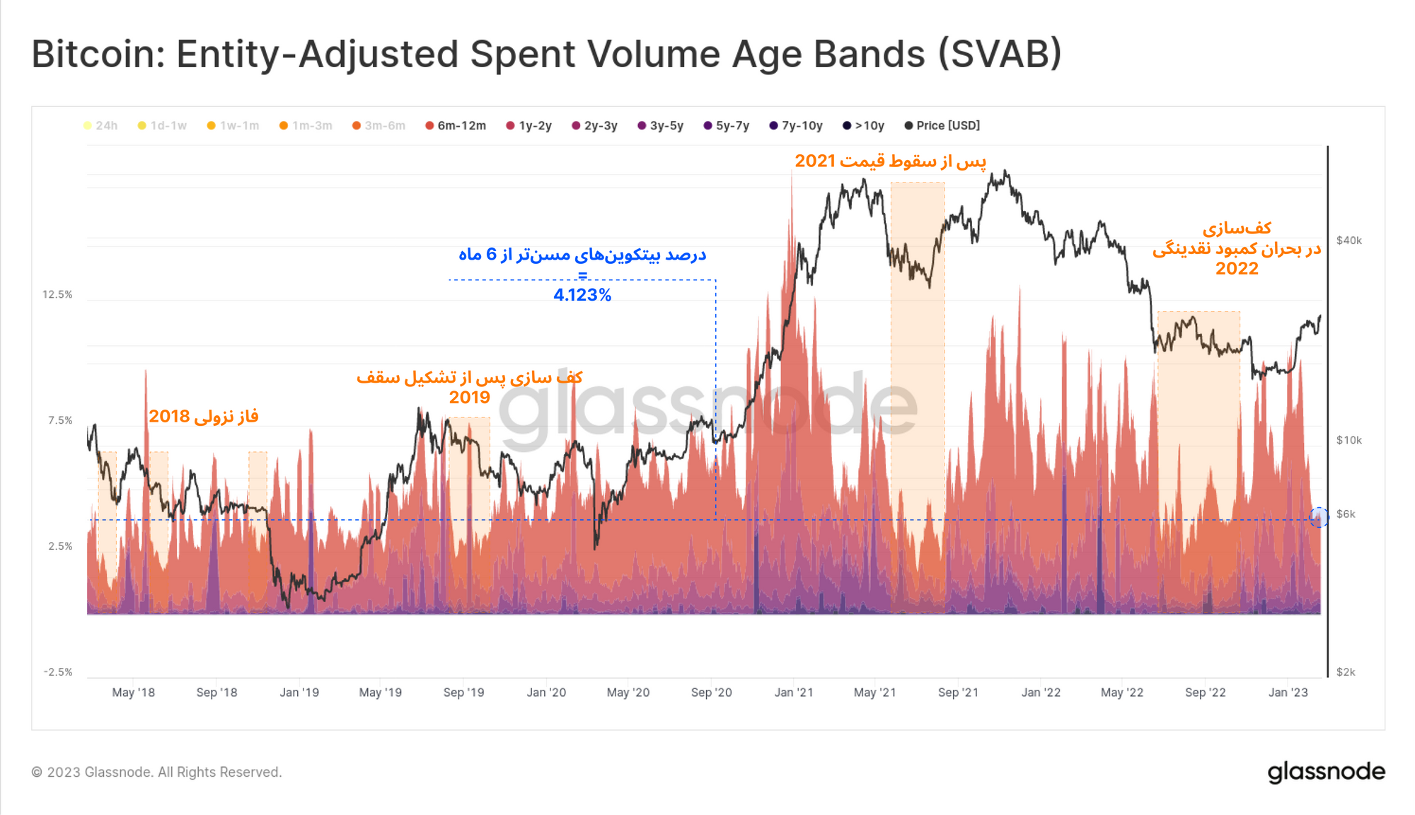این نمودار با رویکردی دقیقتر مشخص میکند که در گروههای سنی مختلف چه میزان بیتکوین خرج میشود. همانطور که مشاهده میکنید، تنها ۴.۱۲۳ درصد از بیتکوینهایی که در شبکه خرج شدهاند، بیش از شش ماه عمر دارند. در صورتی که سابقه بازار را مشاهده کنیم خواهیم دید که در فاز نزولی ۲۰۱۸ و ۲۰۲۲، سرمایهگذاران قدیمی به میزان شرایط فعلی، تمایلی برای خرج کردن بیتکوینهای خود نداشتند.