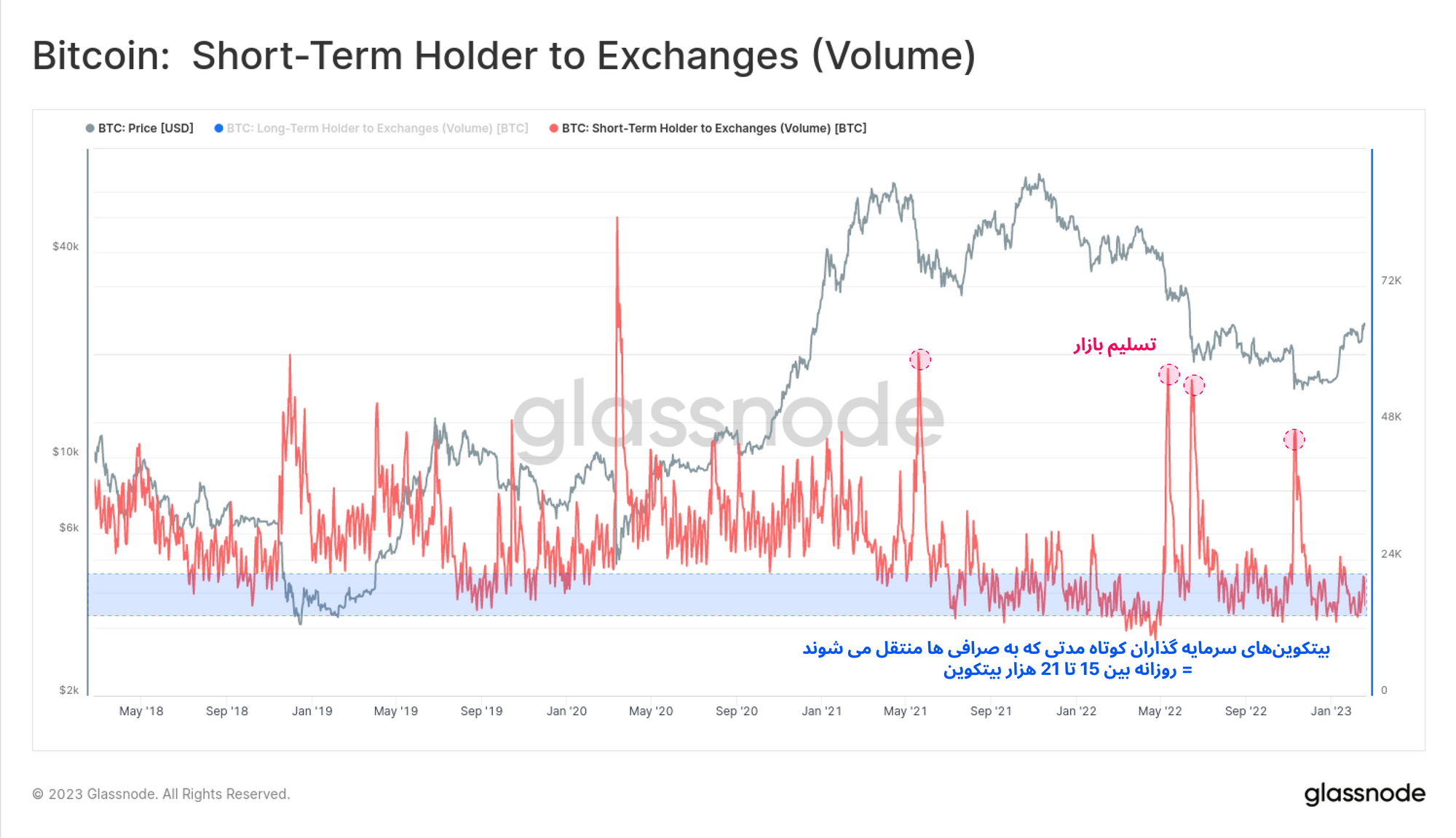 اگر بخواهیم صرفاً حجم بیتکوینهایی که سرمایهگذاران کوتاهمدت به صرافیها منتقل میکنند بررسی کنیم، با این مشاهده به نظر نمیرسد که این گروه فعلا انگیزهی کافی برای انتقال بیتکوینهای خود به صرافیها داشته باشد. در حال حاضر مجموع حجمی که این گروه به صرافیها انتقال میدهد، به صورت روزانه ۱۵ هزار تا ۲۱ هزار بیتکوین است که طبق نمودار در ماه ژوئن ۲۰۲۱ نیز، در محدودهی یکسانی قرار داشت.