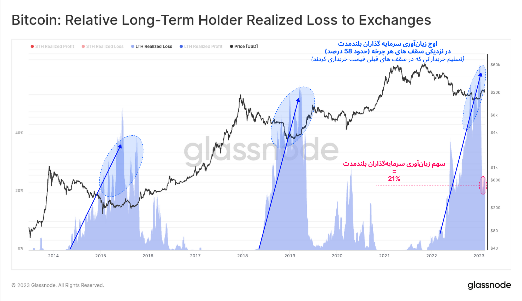 در پایان این گزارش به سرمایهگذاران بلندمدت میپردازیم. این سرمایهگذاران در اعماق چرخههای نزولی، بیشترین زیان را متحمل میشوند. همانطور که آخرین خریداران متعلق به چرخههای قبل در آخرین مرحله فاز نزولی به تدریج از پوزیشنهای معاملاتی زیانآور خود بیرون میآیند، زیان سرمایهگذاران بلندمدت نیز به تدریج افزایش پیدا میکند. آخرین مرحله از تسلیم سرمایهگذاران بلندمدت و یا به عبارتی زیانآوری آنها، در محدوده کف قیمتی آن چرخه به اوج خود میرسد و نوید تغییر جهت بازار را میدهد.