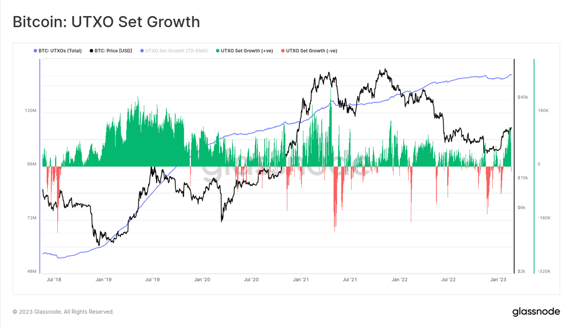 نمودار زیر مجموع تعداد تمام UTXOهای شبکه 🔵 را نشان میدهد. در حال حاضر تعداد UTXOهای شبکه به سقف جدیدی رسیده و رکورد تشکیل ۱۳۷ میلیون عدد UTXO را به ثبت رسانده است.🟢🔴 در صورتی که میزان رشد تعداد UTXOها را به صورت ماهیانه در نظر بگیریم، مشاهده میکنیم که رشد تعداد UTXOها به طور ماهیانه ۱۱۷ هزار عدد بوده و با توجه به نمودار، این میزان رشد از دسامبر سال گذشته بیسابقه است.