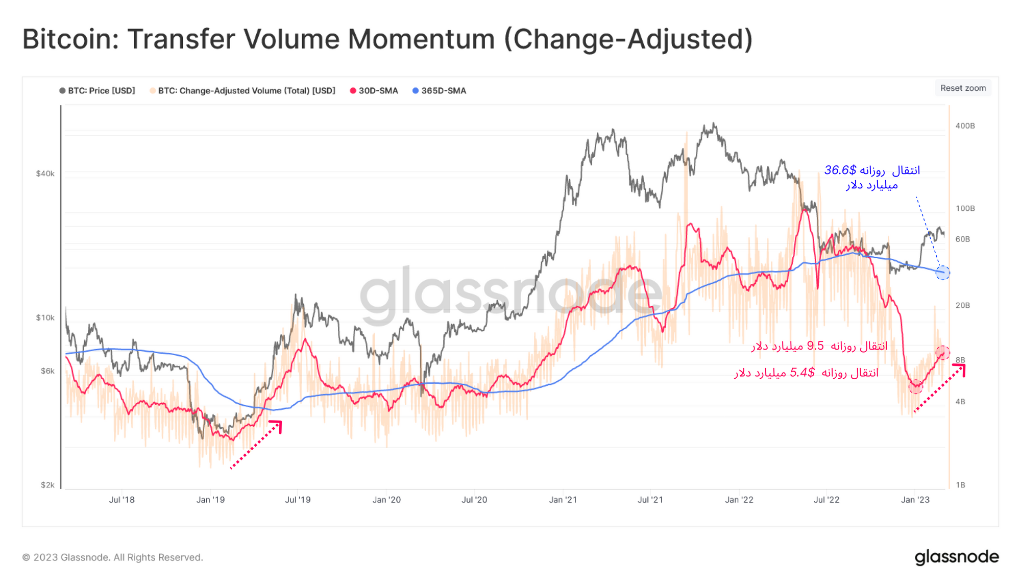 از اوایل ماه ژانویه، میانگین ماهیانه بیتکوینهایی که در گردش بازار انتقال داده میشوند، ۷۹ درصد افزایش داشته است و هم اکنون حجم تبادلات شبکه به صورت روزانه ۹.۵ میلیارد دلار است؛ اما با وجود افزایش تبادلات شبکه، میانگین ماهیانه همچنان از میانگین سالیانه حجم تبادلات شبکه فاصله دارد و عمیقا تحت تأثیر معاملات مرتبط با FTX/Alameda قرار دارد(در هفتهنامه شماره ۳ با آن اشاره شد).