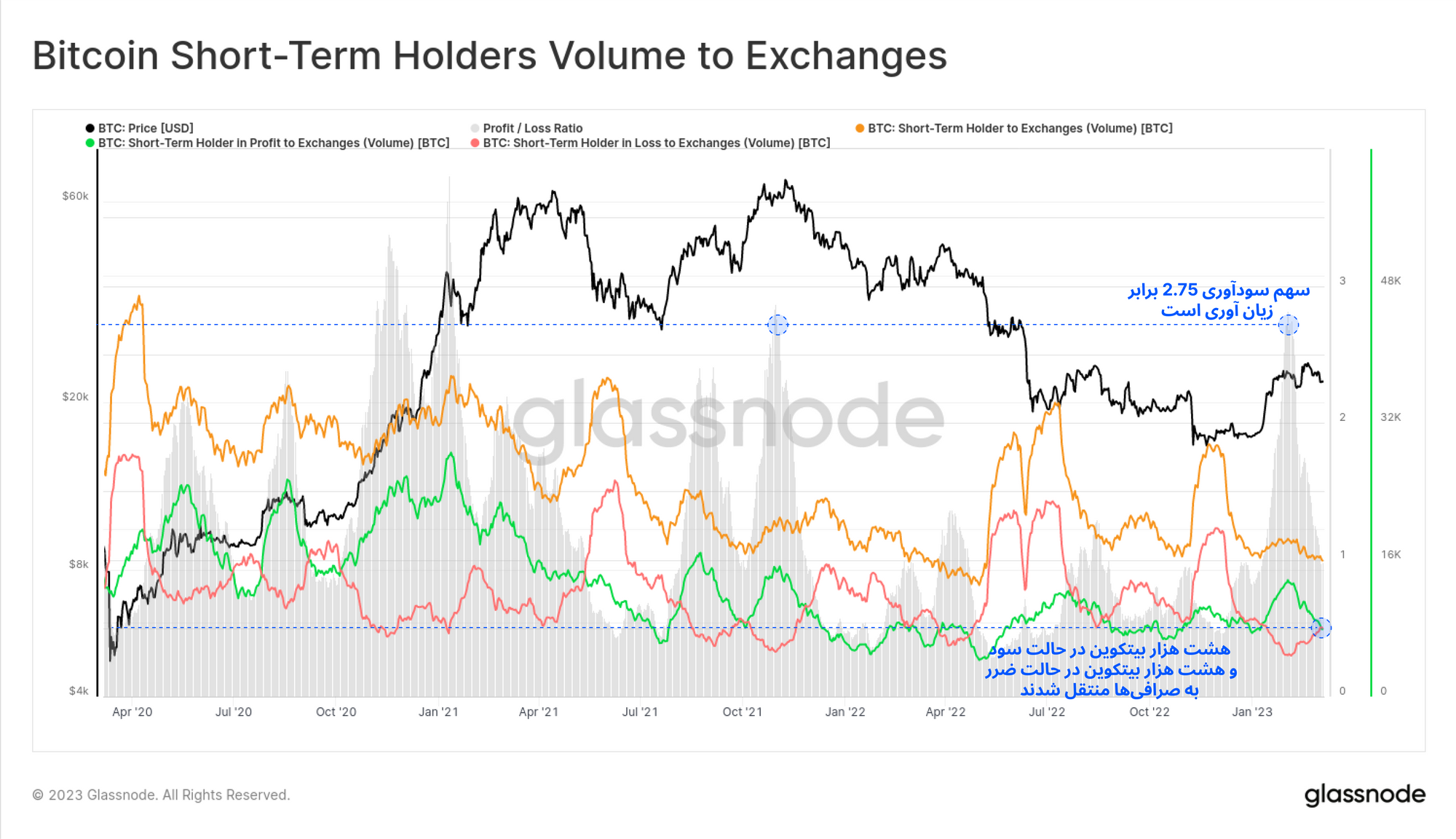 در حال حاضر روزانه ۱۶ هزار بیتکوین متعلق به سرمایهگذاران کوتاهمدت به صرافیها انتقال مییابند که به نسبت مساوی، ۵۰ درصد آنها در حالت سودآور و ۵۰ درصد دیگر در حالت زیانآور به صرافیها منتقل میشوند.