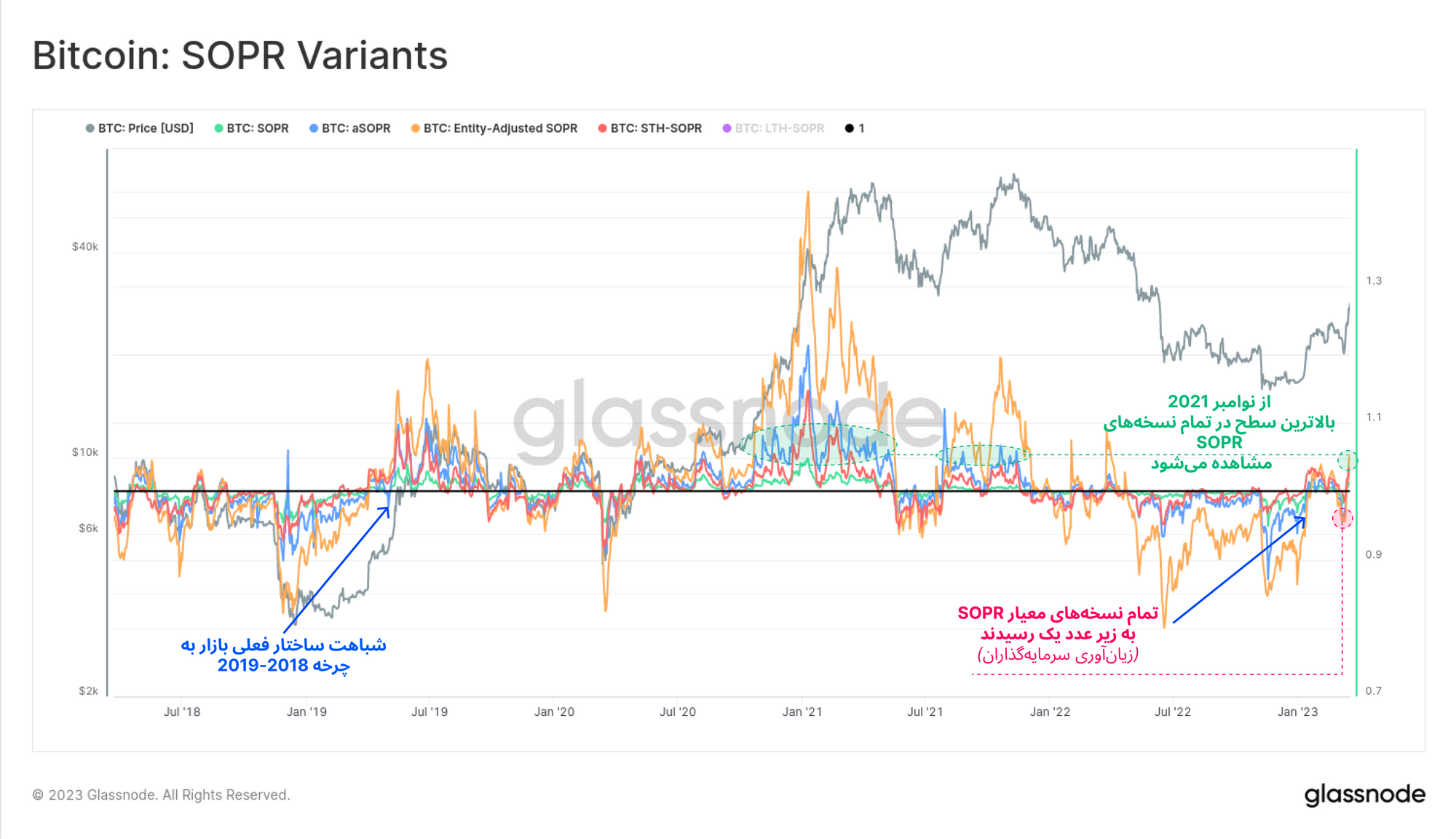 همانطور که مشاهده میکنید در حال حاضر همانند چرخه ۲۰۱۸-۲۰۱۹، میزان سودآوری کلی بازار در حال بهبود است. البته در هفته گذشته با ریزش تمام نسخههای معیار SOPR به زیر ۰، شاهد نقد شدن معاملات زیانآور سرمایهگذاران بودیم.