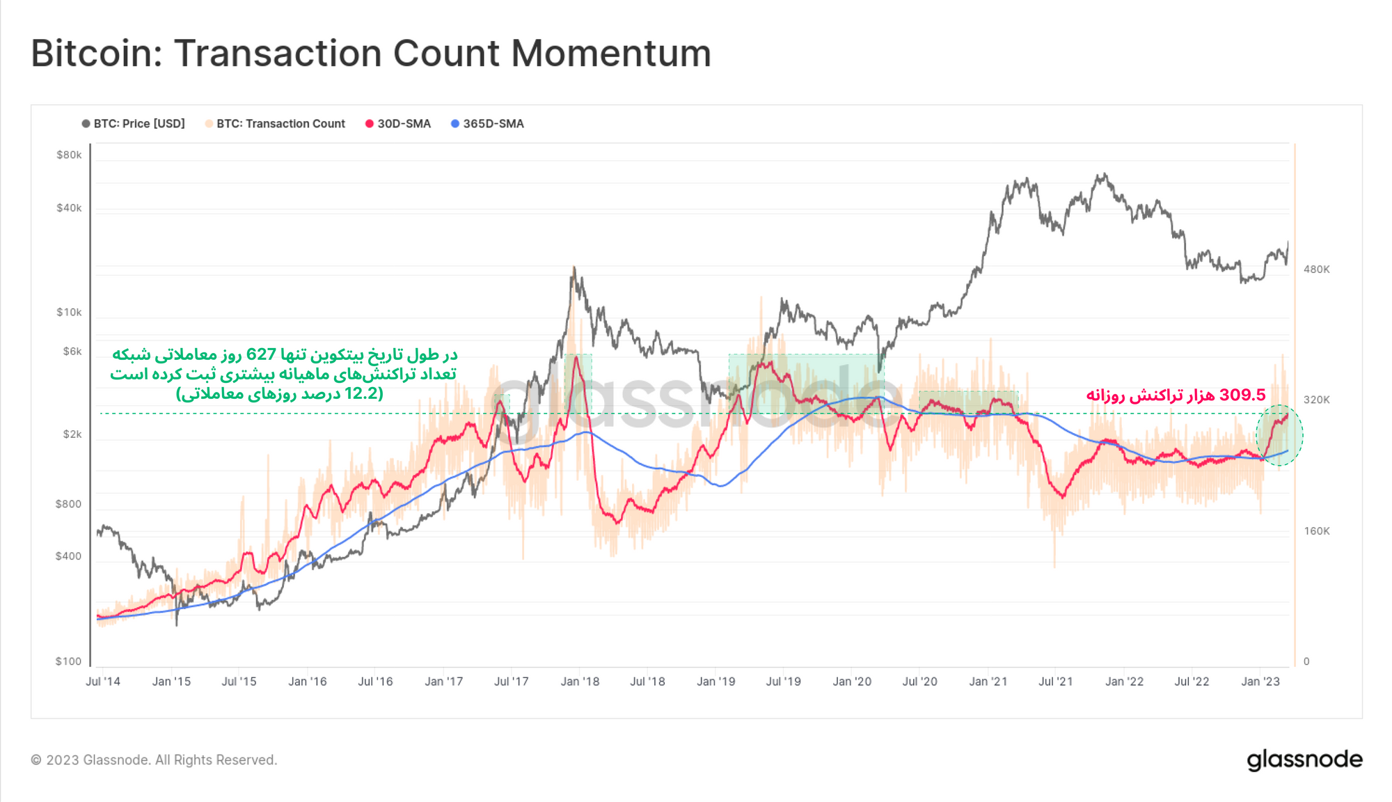 همانطور که مشاهده میکنید، میانگین ماهیانه تراکنشهای شبکه به سطح ۳۰۹ هزار تراکنش در روز رسیده است. علاوه بر اینکه از ماه آوریل ۲۰۲۱ تا کنون، تعداد تراکنش های ماهیانه بیسابقه بوده، موفق به شکست میانگین سالیانه نیز شده است.