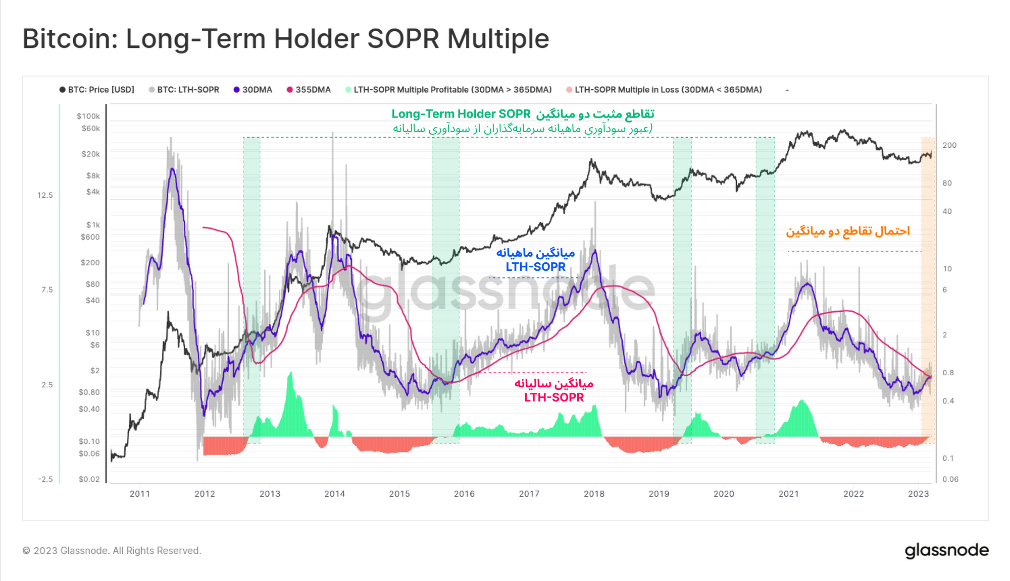 نمودار زیر سودآوری معاملات سرمایهگذاران یلندمدت را نشان میدهد. در حال حاضر مشاهده میکنیم که سودآوری معاملات سرمایهگذاران بلندمدت به محدوده خنثی قدم گذاشته است. همچنین اغلب این سرمایهگذاران بلندمدت از چرخه ۲۰۲۰-۲۰۲۲ بیتکوینهای خود را خریداری کرده و به مدت ۱۲ ماه متوالی زیانآور بودهاند.