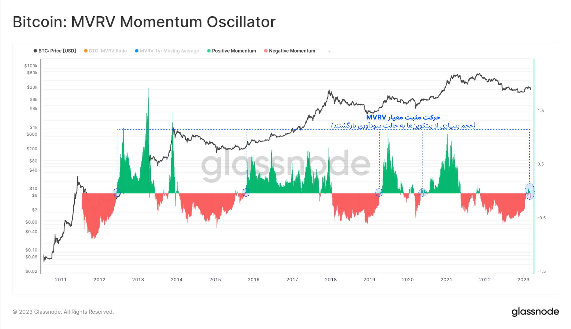 از نمودار زیر برای تشخیص تغییر شرایط سرمایهگذاران در قالب معیار MVRV بهره خواهیم برد. همانطور که مشاهده میکنید این معیار در حال عبور از سطح ۰ است. زمانی که حجم بسیاری از بیتکوینها، در بالای سطح قیمت فعلی خریداری شوند، این معیار به حالت زیان نقد نشده 🔴 تغییر پیدا میکند و زمانی که در پایین سطح قیمتی فعلی 🟢 خریداری شوند، سرمایهگذاران به سود بالقوه خواهند رسید (در محدوده تغییر جهت روند بازار)