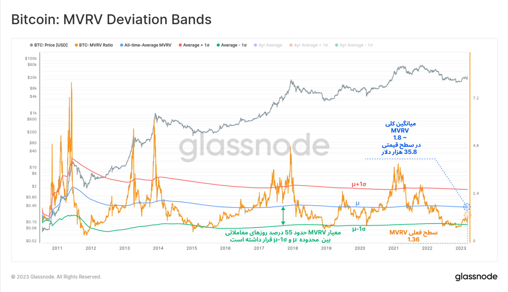 نمودار زیر در حال حاضر نشان میدهد که معیار MVRV به سطح ۱.۳۶ خود دست یافته است که دقیقاً بین میانگین کلی ۱.۸۲ و سطح اشباع فروش ۱- قرار دارد. بیتکوین در اواخر فاز خرسی و اوایل فاز صعودی تاکنون ۵۴ درصد از روزهای معاملاتی را بین این دو سطح گذرانده است.