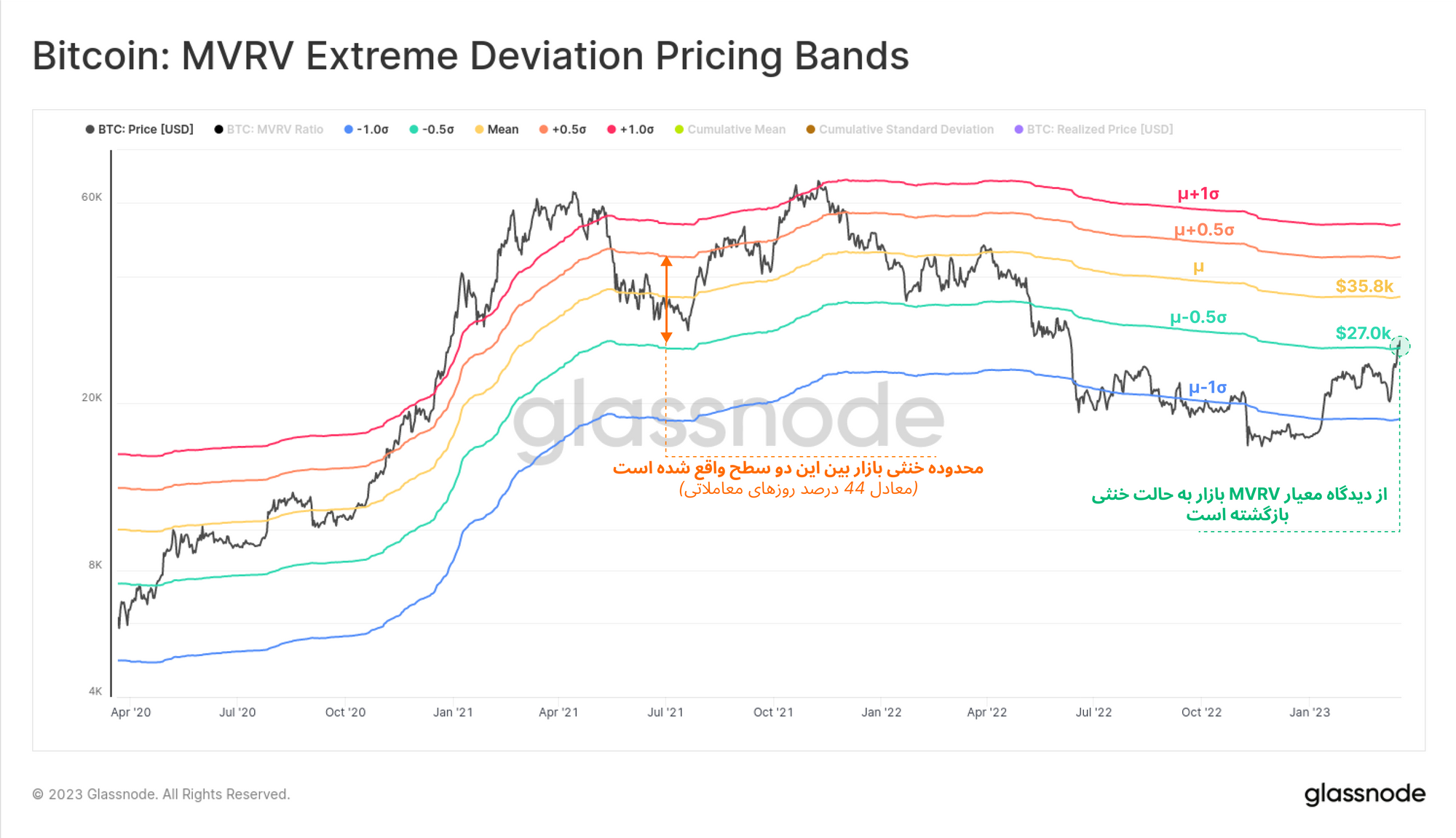 با توجه به اینکه معیار MVRV، از میانگین خرید سرمایهگذاران گرفته شده است؛ اکنون نواحی قیمتی مطابق با سطوح اشاره شده در معیار قبل را محاسبه میکنیم. با عبور قیمت از ناحیه ۲۷ هزار دلار، بازار در حال حاضر به ناحیه خنثی خود دست یافته است. بنابراین طبق این نمودار بازار بیتکوین نسبت به میانگین خرید خود، از ناحیه ارزان قیمت خارج شده است.