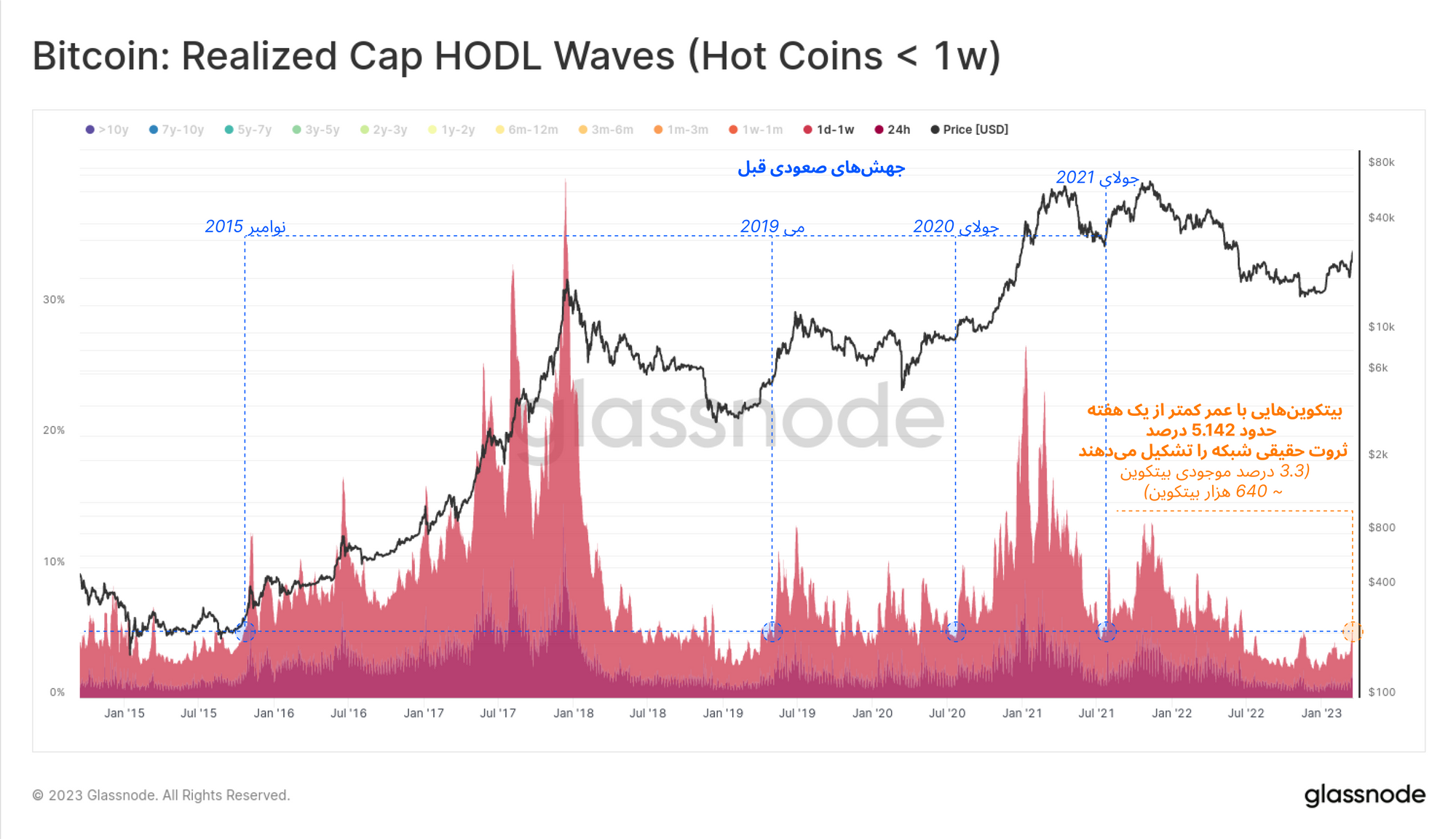 نمودار زیر حجم ثروت دلاری را نشان میدهد که در بیتکوینهای بسیار فعال ( بیتکوینهایی که نهایتا هفت روز عمر دارند) ذخیره شده است. هر زمانی که بیتکوینهای پیر خرج شوند یا به عبارتی سرمایهگذاران بلندمدت تر سود معاملات خود را برداشت کنند، این بیتکوینهای پیر و نسبتا ارزانتر، به سرمایهگذاران جدید رسیده و به بیتکوینهای جوانتر تبدیل خواهند شد.