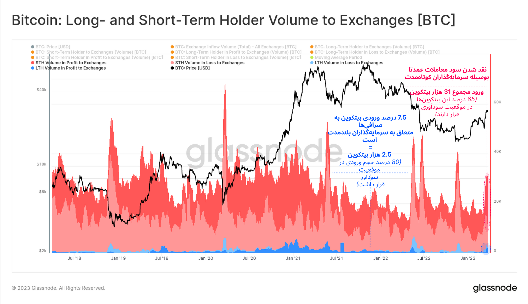 · حدود ۷.۵ درصد حجم ورودی به صرافیها متعلق به سرمایهگذاران بلندمدت است که ۸۰ درصد از این بیتکوینها در موقعیت سودآور به صرافیها منتقل شدند.