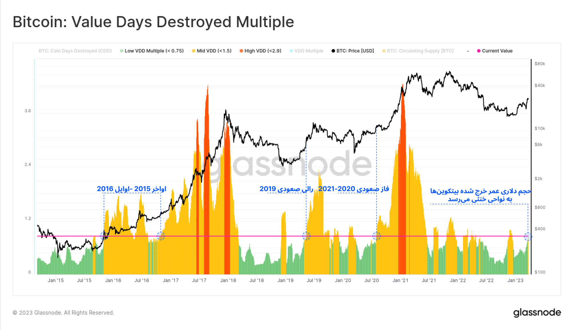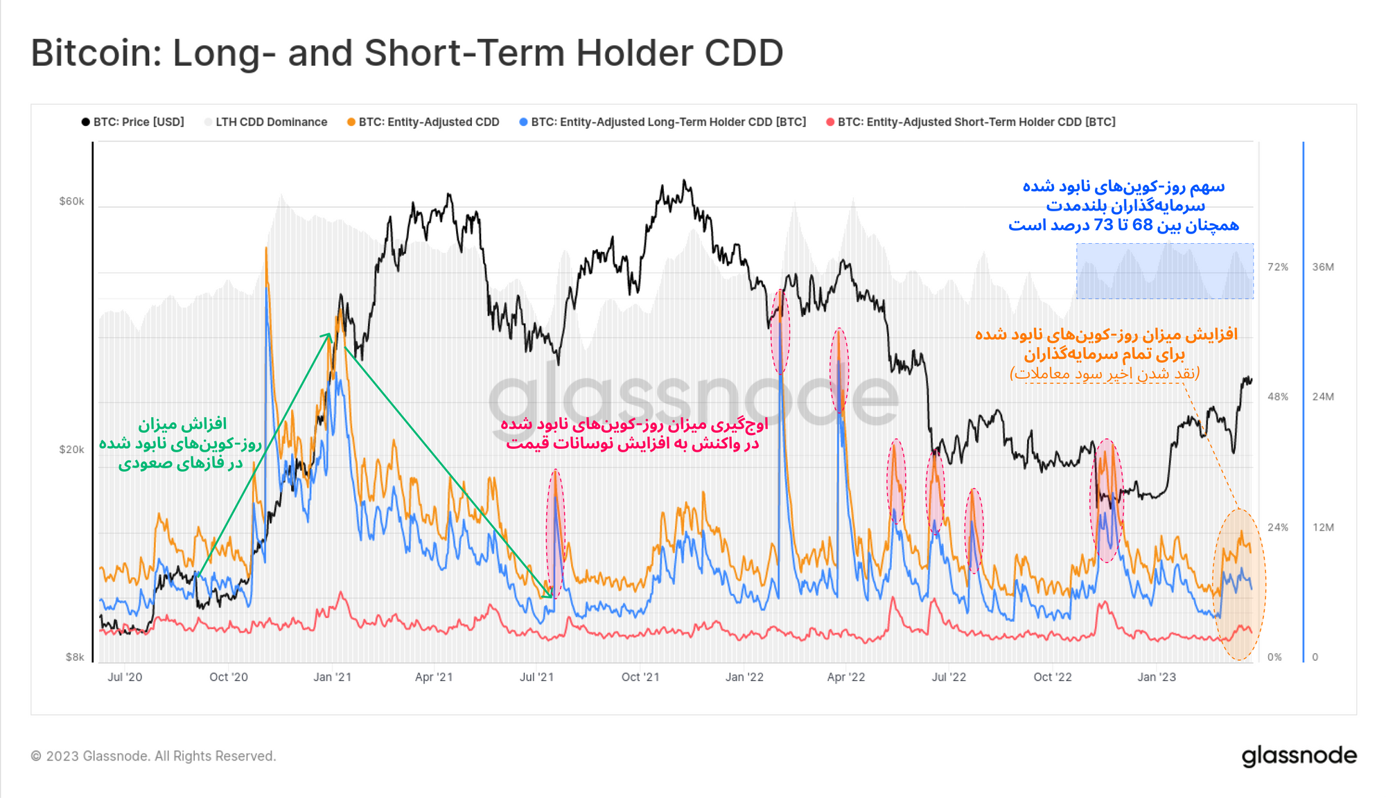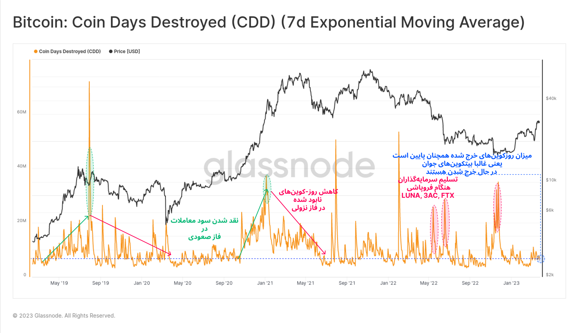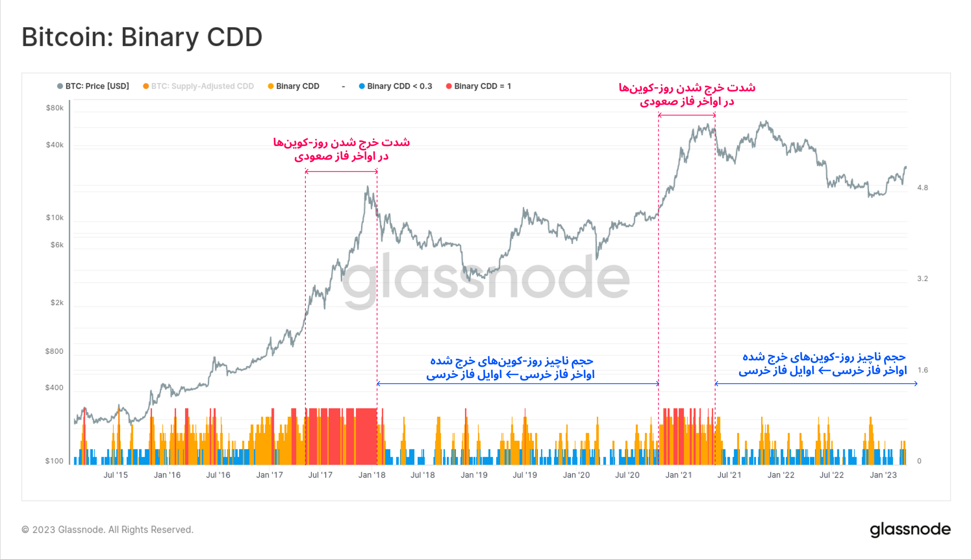 · جهش صعودی CDD هنگام نوسانات ناگهانی بازار معمولاً در ریزش قیمت رخ میدهد و به معنای نفوذ ترس میان سرمایهگذاران و تمایل آنها برای خرج کردن بیتکوینهاست.