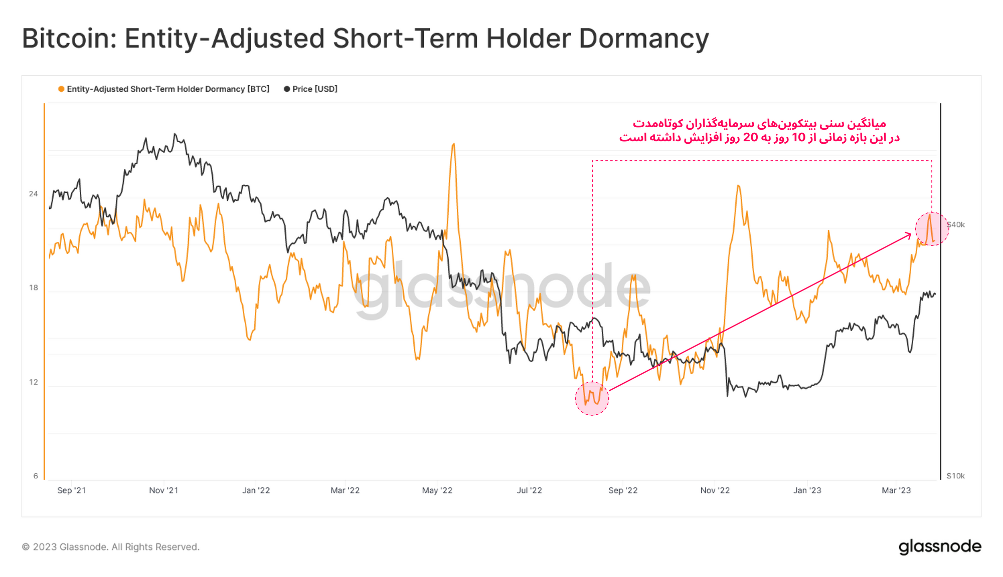 نمودار زیر میانگین عمر بیتکوینهای خرج شده را نشان میدهد .اکنون اگر میانگین عمر بیتکوینهای خرج شده سرمایهگذاران کوتاهمدت را در نظر بگیریم، مشاهده خواهیم کرد که از زمان سقوط FTX، میانگین عمر بیتکوینهای این سرمایهگذاران تقریباً ۱۰ روز بوده و تا کنون به ۲۱ روز رسیده است. بنابراین طبق این نمودار سرمایهگذاران کوتاهمدتی که در محدوده کف قیمت بیتکوین خریداری کرده، در چند هفته اخیر بیشترین سود را در معاملات خود نقد کردهاند.