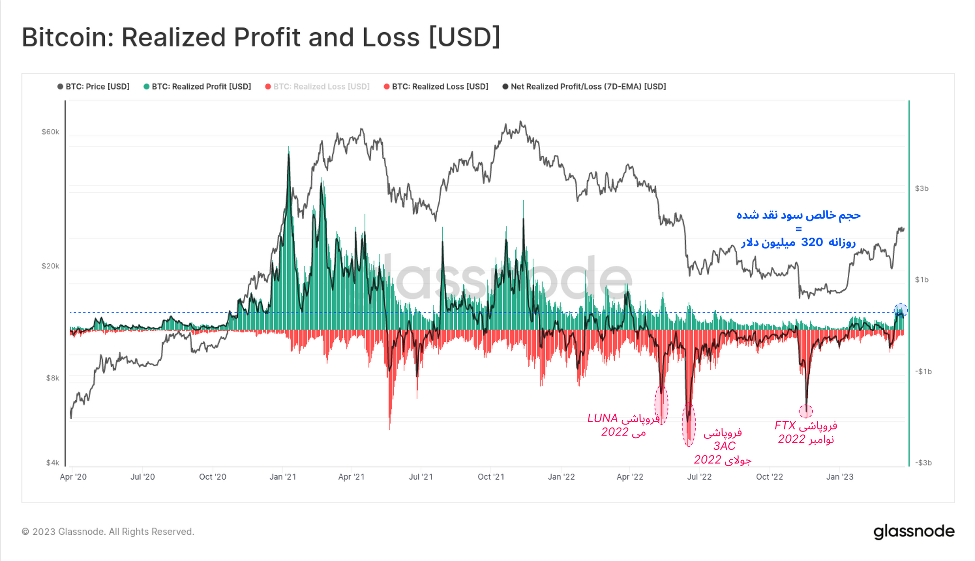 اگر حجم سود و زیان نقد شده معاملات بازار را به صورت دلاری در نظر بگیریم، مشاهده میکنیم که سرمایهگذاران در هفتههای اخیر به صورت خالص روزانه ۳۲۰ میلیون دلار سود در معاملات خود نقد کردهاند. از ماه می ۲۰۲۲ ، دقیقاً قبل از سقوط پروژه LUNA-UST، این بالاترین میزان سودآوری معاملات بازارشمرده میشود؛ اما همچنان نسبت به سودآوری در فازهای صعودی گذشته بازار پایینتر است.