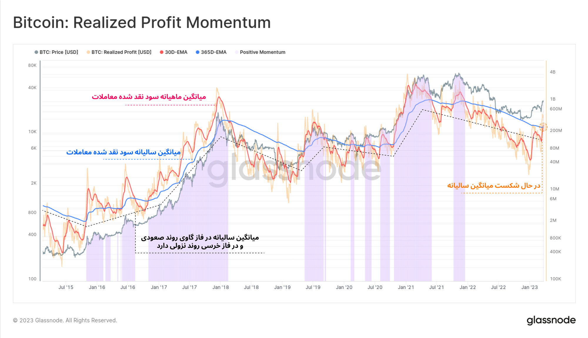 با دقت بیشتر به این نمودار مشخص خواهد شد که در فاز صعودی، سود نقد شده معاملات بازار افزایش پیدا میکند و در فاز نزولی به حداقل خود میرسد. همچنین مشاهده می کنید که در فاز صعودی، روند کلی میانگین سالیانه سودآوری بازار رو به بالا و در فاز نزولی رو به پایین است.