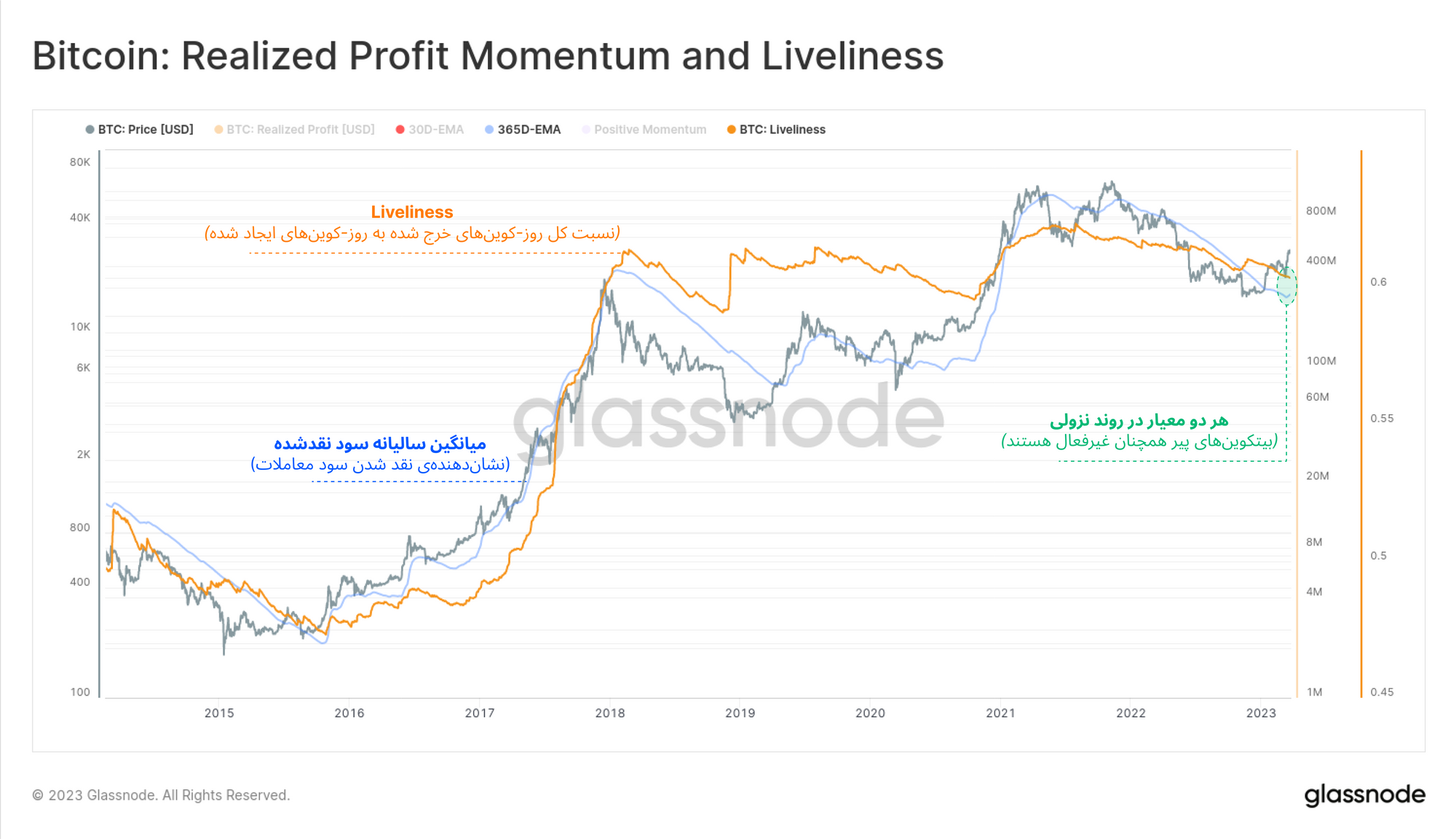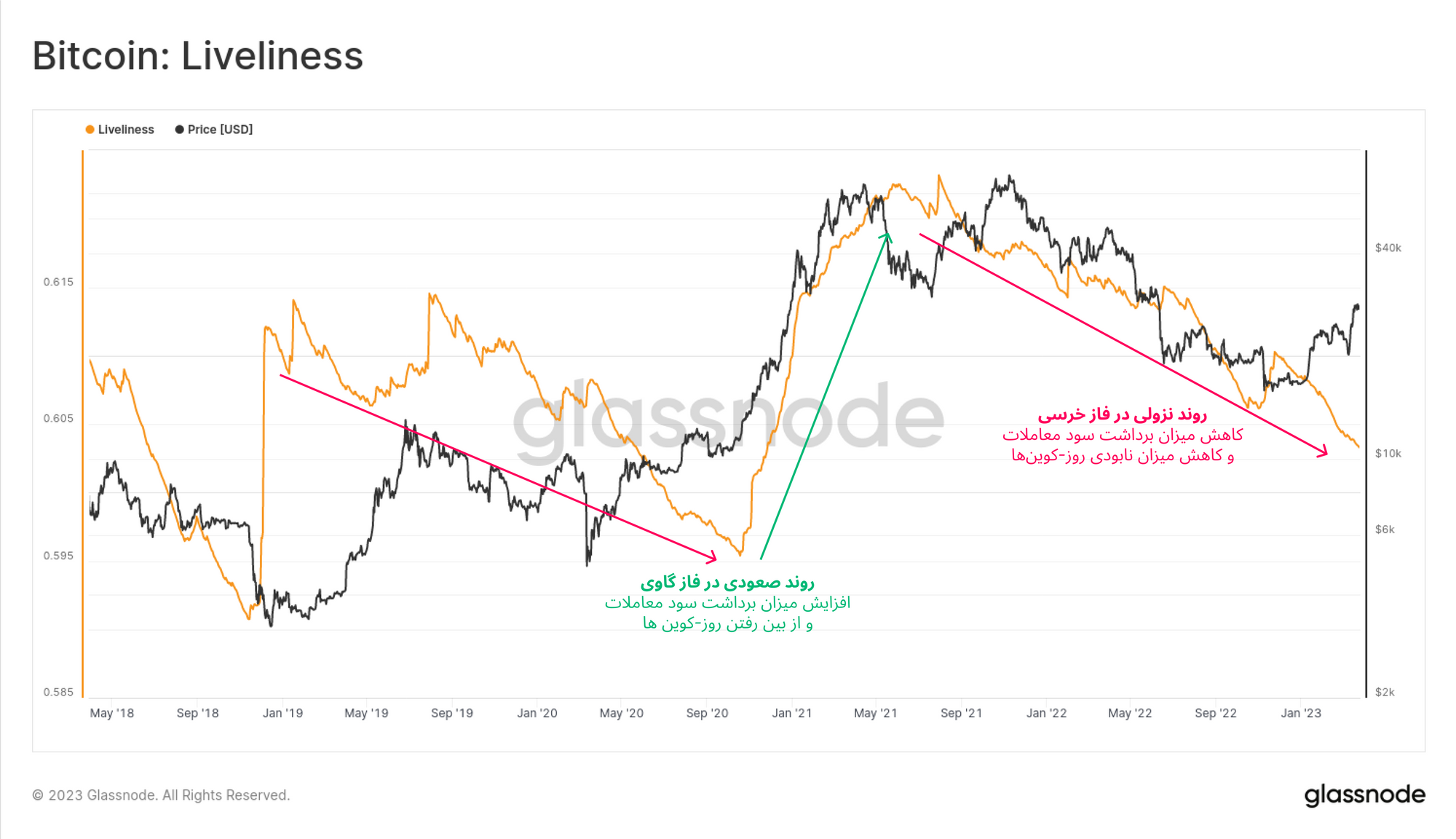 · زمانی که معیار Liveliness در روند نزولی قرار داشته باشد، بازار هولدکردن را ترجیح میدهد و در این فاصله به عمر بیتکوینها افزوده میشود که حاکی ازاعتماد سرمایهگذاران به بیتکوین است.