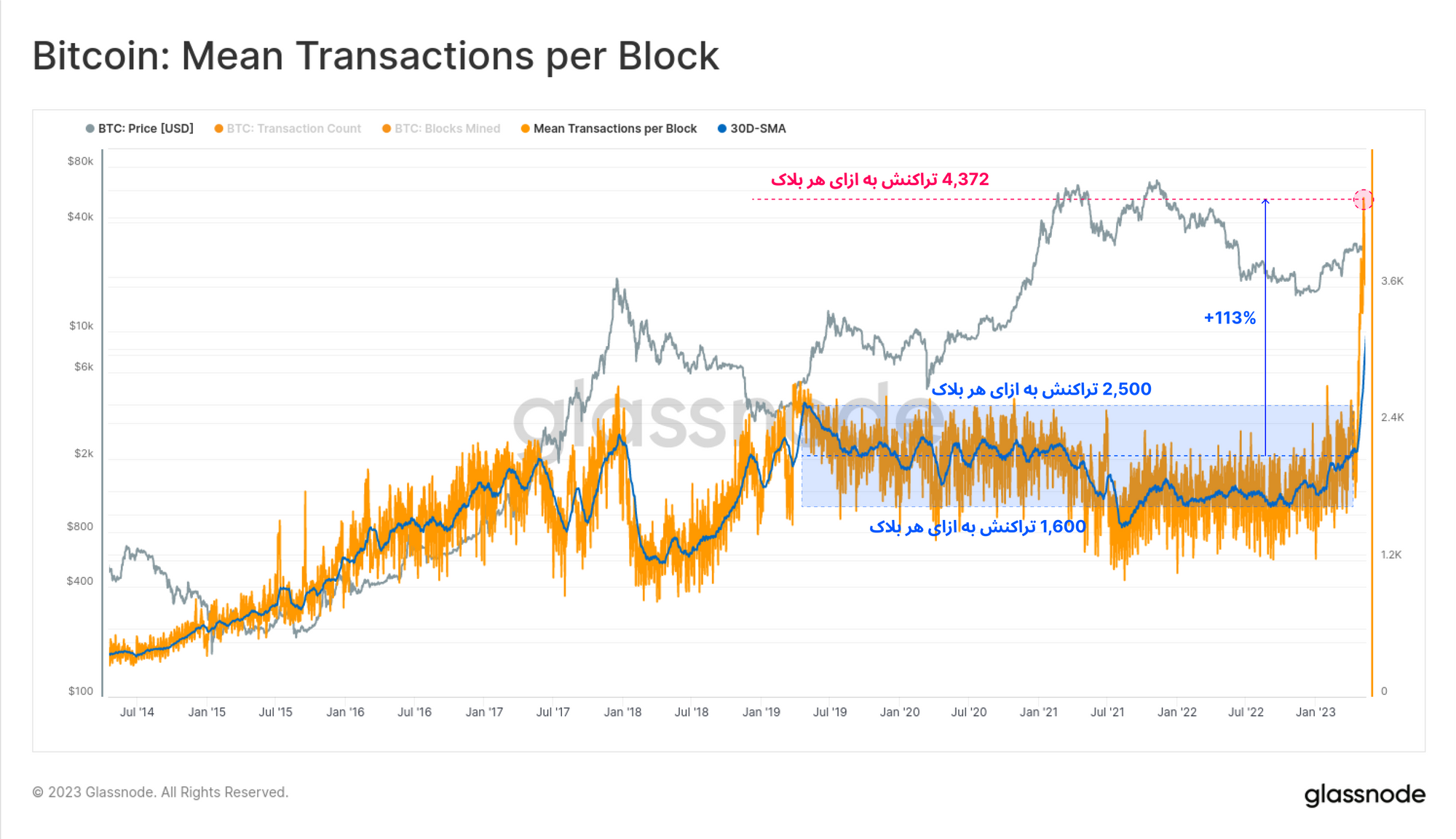 تعداد تراکنشهایی که ماینرها در هر بلاک ذخیره کردهاند نیز به صورت میانگین دو برابر شده است. در حالت عادی معمولا ۲ هزار تراکنش در هر بلاک ثبت میشد اما هماکنون ماینرها بیش از ۴۳۰۰ تراکنش در یک بلاک ثبت میکنند.