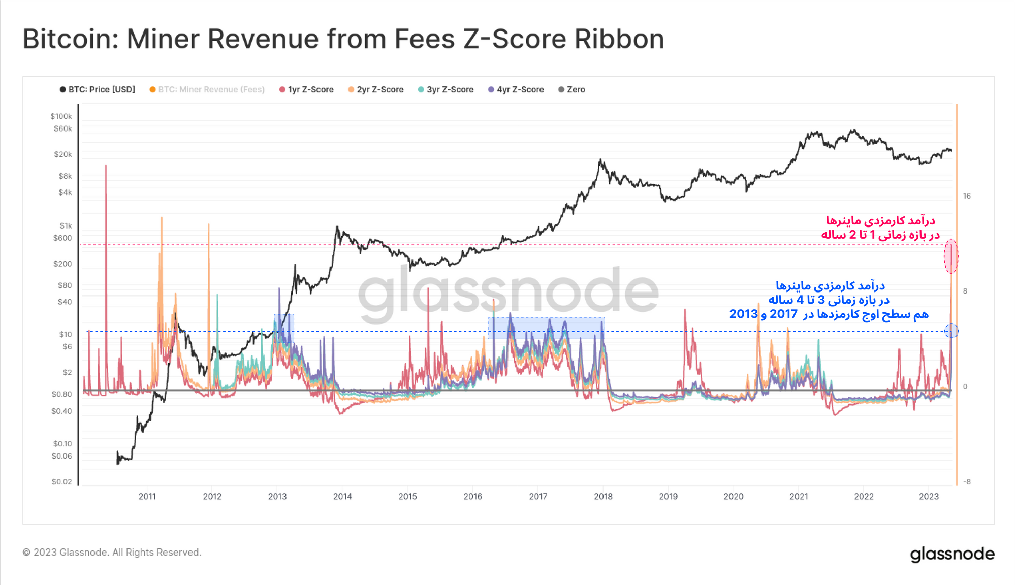 کارمزدهای شبکه در بازه ۱ تا ۲ ساله بیشترین افزایش را ثبت کرده و به بیشترین میزان از حد معمول خود فاصله گرفتهاند. این بازه زمانی را صرفا میتوان با سال ۲۰۱۱، دوران آغاز روزهای معاملاتی بیتکوین مقایسه کرد. در بازه زمانی ۳ تا ۴ ساله نیز سرعت رشد کارمزد تراکنشها نسبت به فاز صعودی ۲۰۲۱ بسیار بالاتر بوده و این بازه زمانی را میتوان با سال ۲۰۱۳ و ۲۰۱۷ مقایسه کرد.